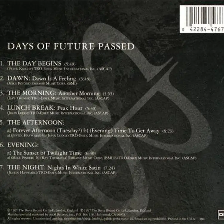 1 The Day Begins Written-By – Peter Knight (5) Written-By [Uncredited, Morning Glory] – Graeme Edge 5:49 2 Dawn: Dawn Is A Feeling Written-By – Mike Pinder 3:48 3 The Morning: Another Morning Written-By – Ray Thomas 3:55 4 Lunch Break: Peak Hour Written-By – John Lodge 5:30 5 The Afternoon: Forever Afternoon (Tuesday?): (Evening) Time To Get Away Written-By [(Evening) Time To Get Away] – John Lodge Written-By [Forever Afternoon (Tuesday?)] – Justin Hayward 8:23 6 Evening: The Sun Set: Twilight Time Written-By [The Sunset] – Mike Pinder Written-By [Twilight Time] – Ray Thomas 6:40 7 The Night: Nights In White Satin Written-By – Justin Hayward Written-By [Uncredited, Late Lament] – Graeme Edge 7:24