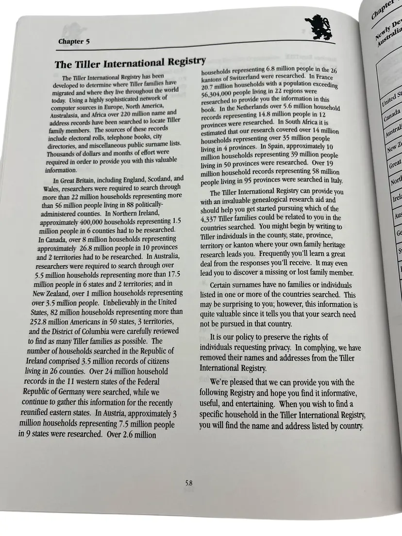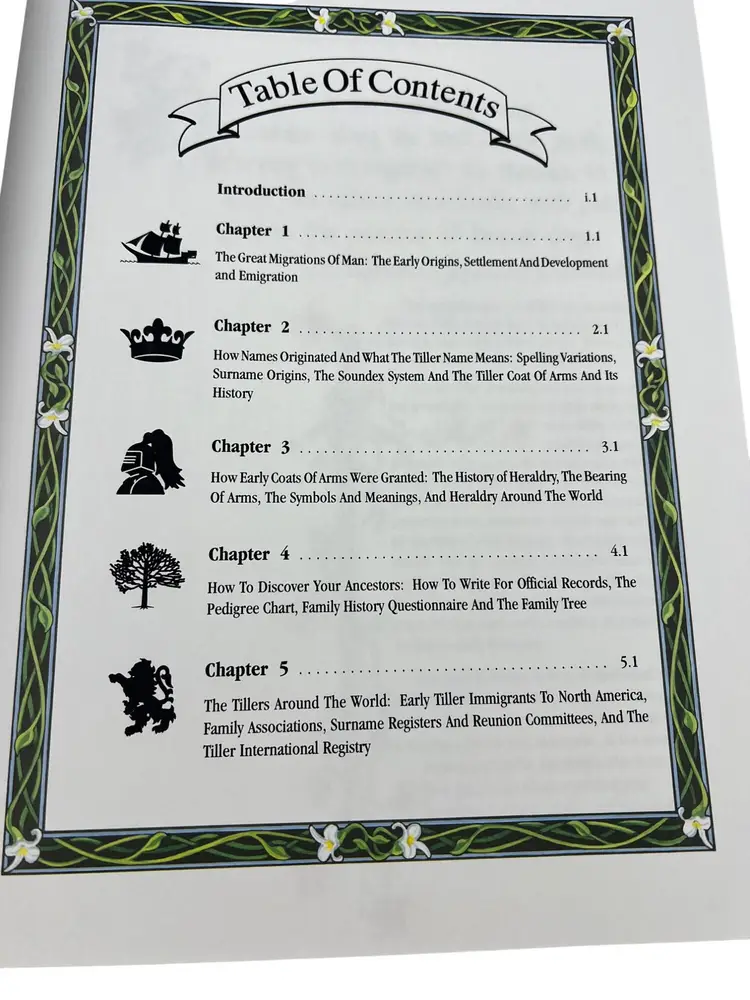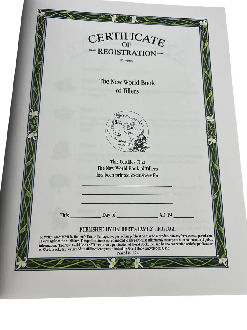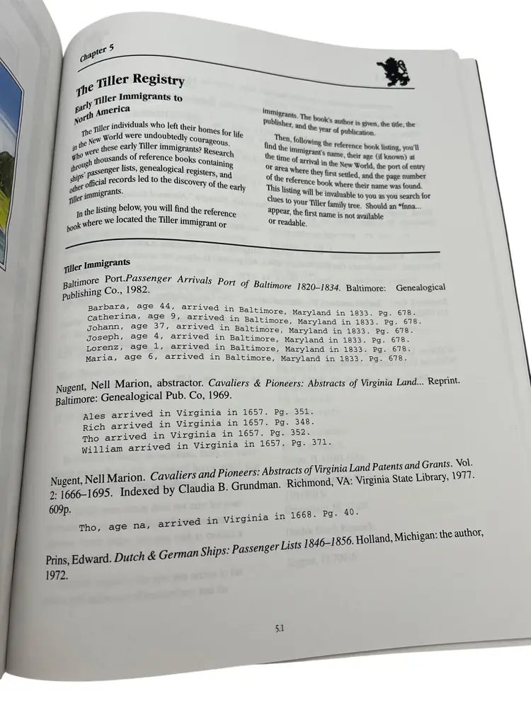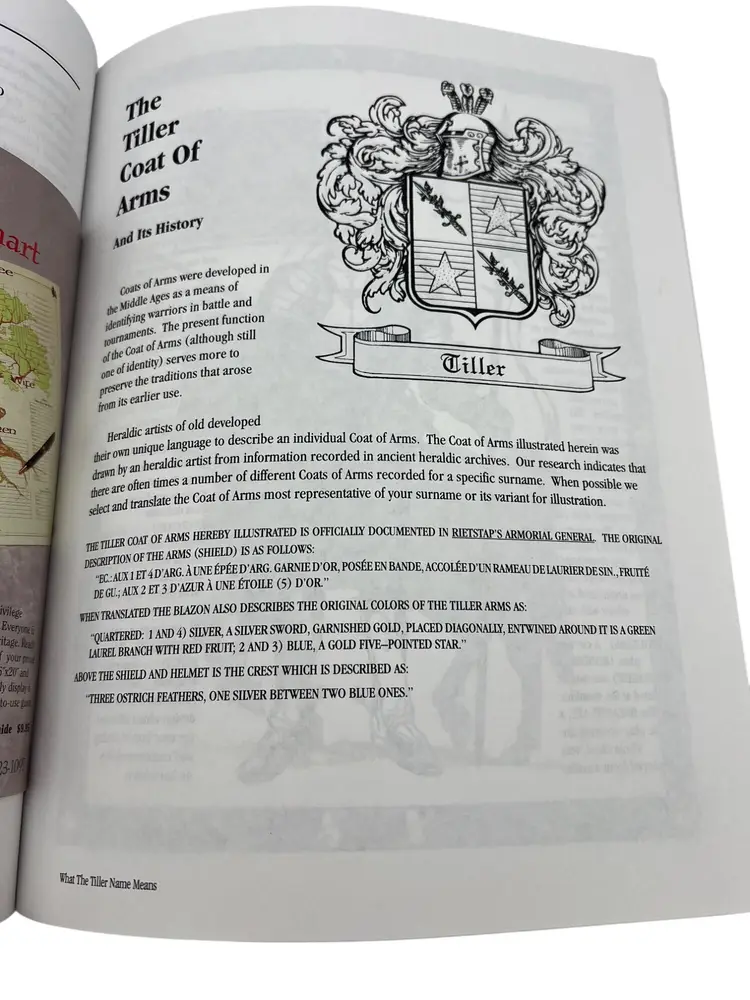 Comprehensive genealogical resource exploring the Tiller family name, origins, coats of arms, and historical lineage with a personalized certificate. The book has a soft cover and measures 10.75" x 8.25". Published in 1997.