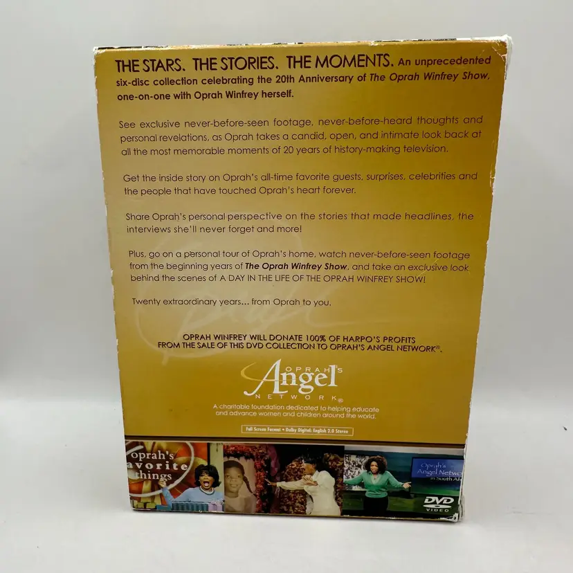 The Stars. The Stories. The Moments. An unprecedented six-disc collection celebrating the 20th Anniversary of THE Oprah WINFREY SHOW one-on-one with Oprah Winfrey herself. See exclusive never-before-seen footage never-before-heard thoughts and personal revelations as Oprah takes a candid open and intimate look back at all the most memorable moments of 20 years of history-making television. Get the inside story on Oprah s all-time favorite guests surprises celebrities and the people that have touched Oprah s heart forever. Share Oprah s personal perspective on the stories that made headlines the interviews she ll never forget and more! Plus go on a personal tour of Oprah s home watch never-before-seen footage from the beginning years of THE Oprah WINFREY SHOW and take an exclusive look behind the scenes of a DAY IN THE LIFE OF THE Oprah WINFREY SHOW! Twenty extraordinary years.. from Oprah to you. Oprah Winfrey will donate 100% of Harpo s profits from the sale of this DVD Collection to Oprah s Angel Network®.