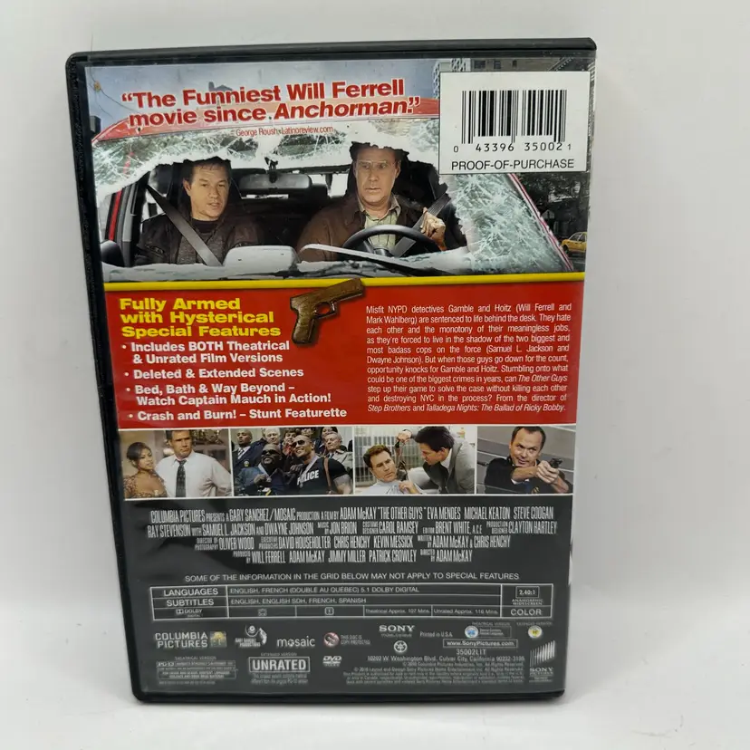 UNRATED. Misfit NYPD detectives Gamble and Hoitz (Will Ferrell and Mark Wahlberg) are sentenced to life behind the desk. They hate each other and the monotony of their meaningless jobs as they re forced to live in the shadow of the two biggest and most badass cops on the force (Samuel L. Jackson and Dwayne Johnson). But when those guys go down for the count opportunity knocks for Gamble and Hoitz. Stumbling onto what could be one of the biggest crimes in years can THE OTHER GUYS step up their game to solve the case without killing each other and destroying NYC in the process? from the director of STEP BROTHERS and TALLADEGA NIGHTS: THE BALLAD OF RICKY BOBBY. Directed by Adam McKay. Starring Will Ferrell Mark Wahlberg Eva Mendes Michael Keaton.