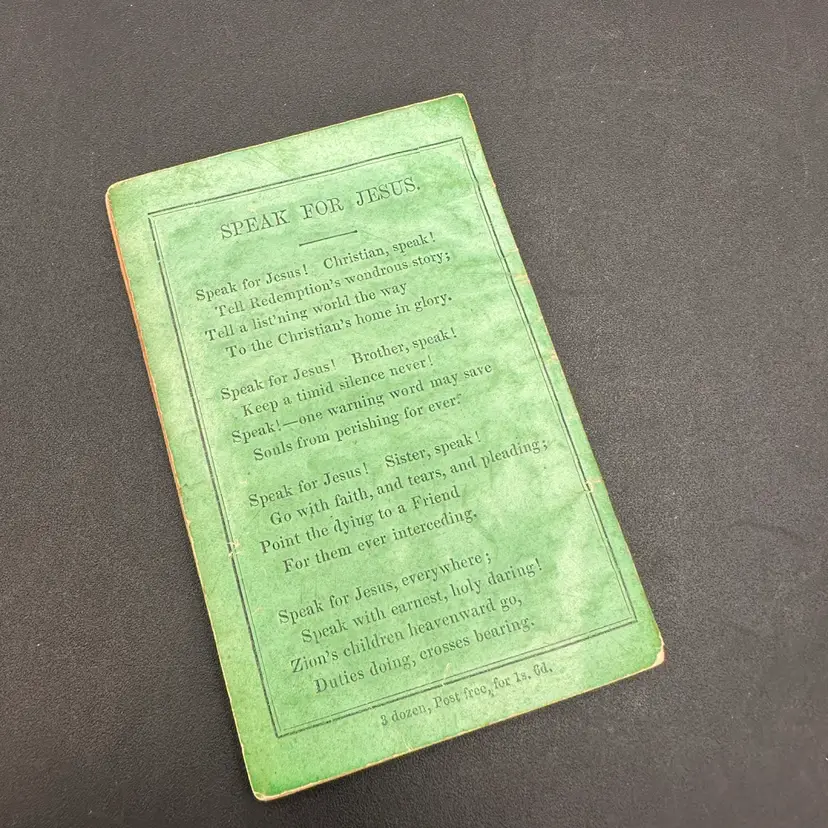 During the mid-19th century, the railway was a primary site for missionary work. Organisations like the Religious Tract Society produced thousands of such booklets, often with catchy titles like "The Railway Journey" or "The Last Ticket," to engage a captive audience of passengers. This specific title, Speak for Jesus, suggests an exhortation for Christians to use their travel time for evangelism.