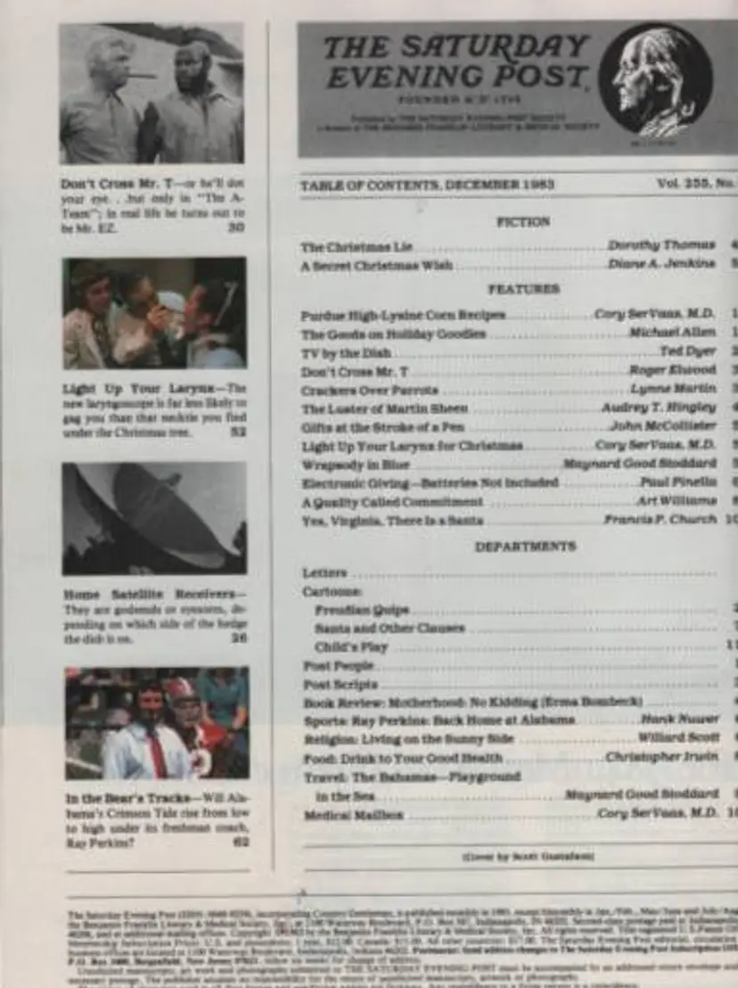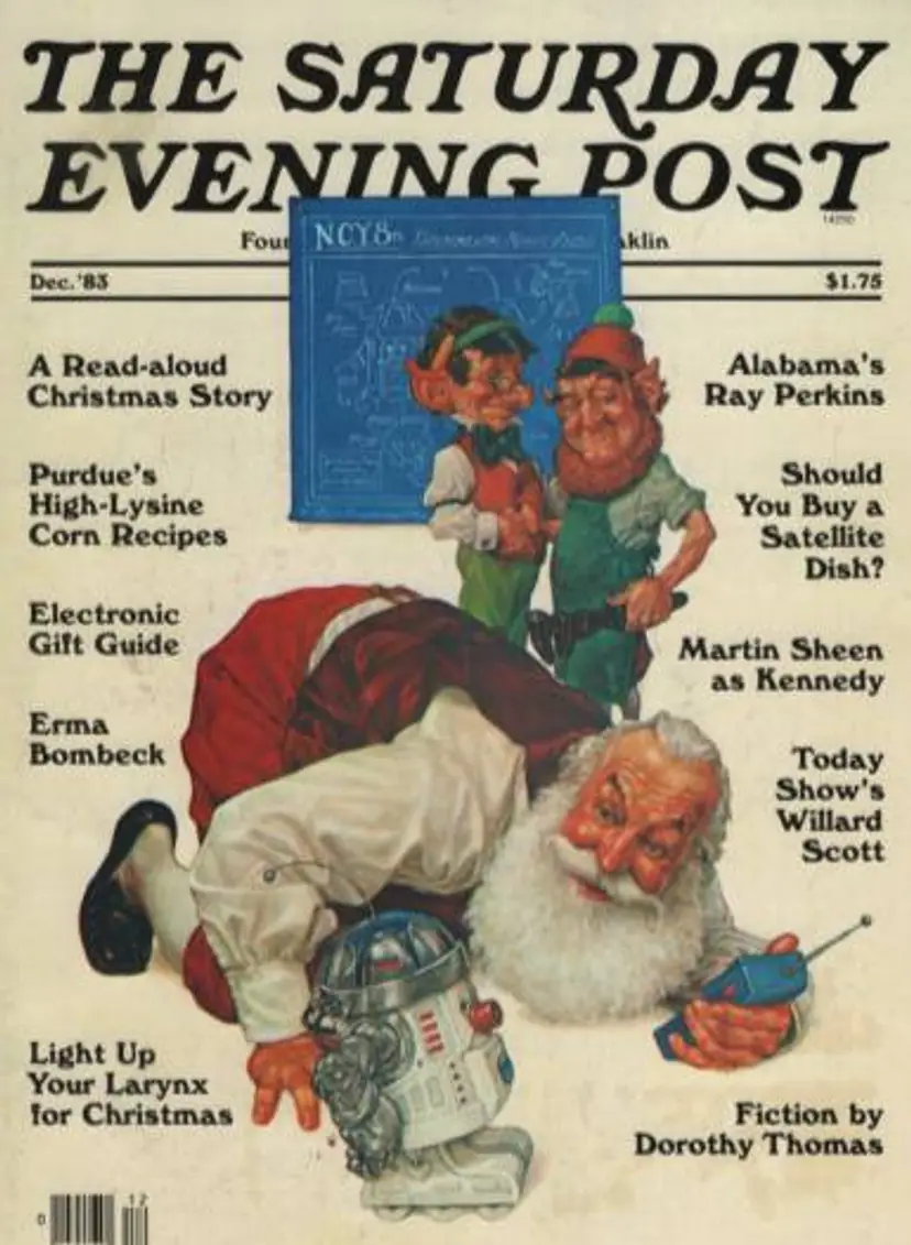 Vintage issue of The Saturday Evening Post from December 1983. Front cover shows Santa with elves and R2D2. Cover price then was $1.75. Advertisements of the time, gift guide based on products from 1983, and articles.