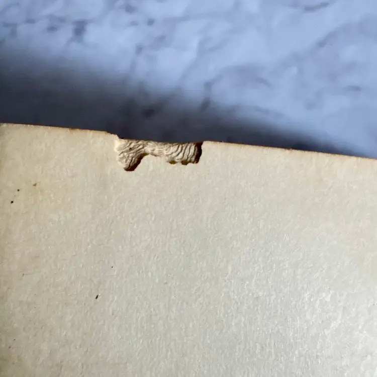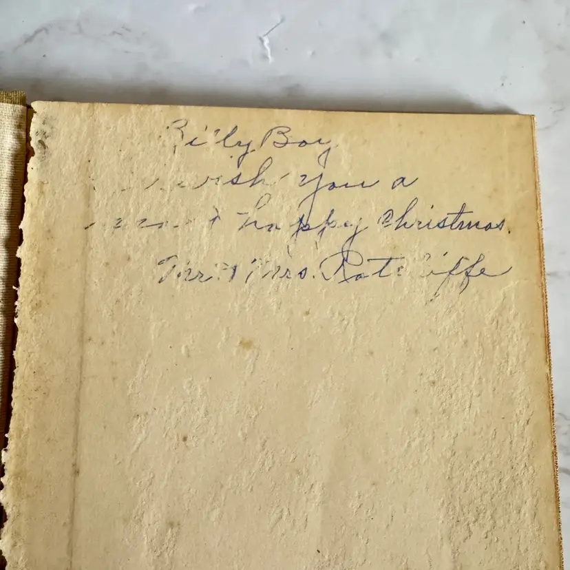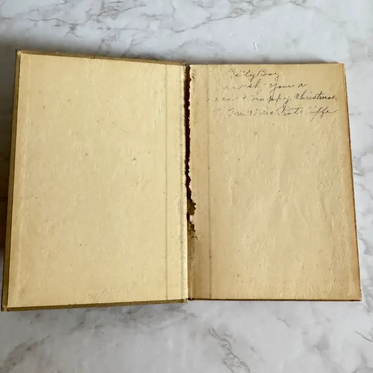 Poor vintage condition with significant wear, inscription, yellowing, and chew holes on the pages. 5-1/2” x 7-1/2”