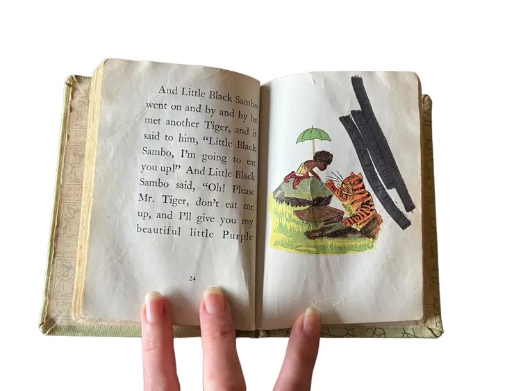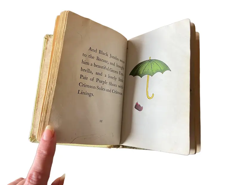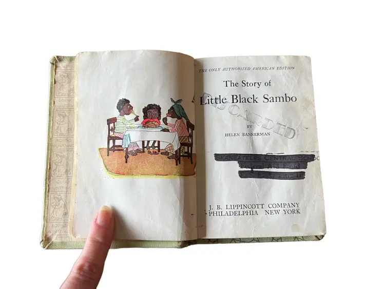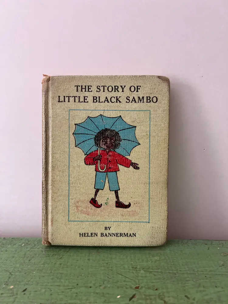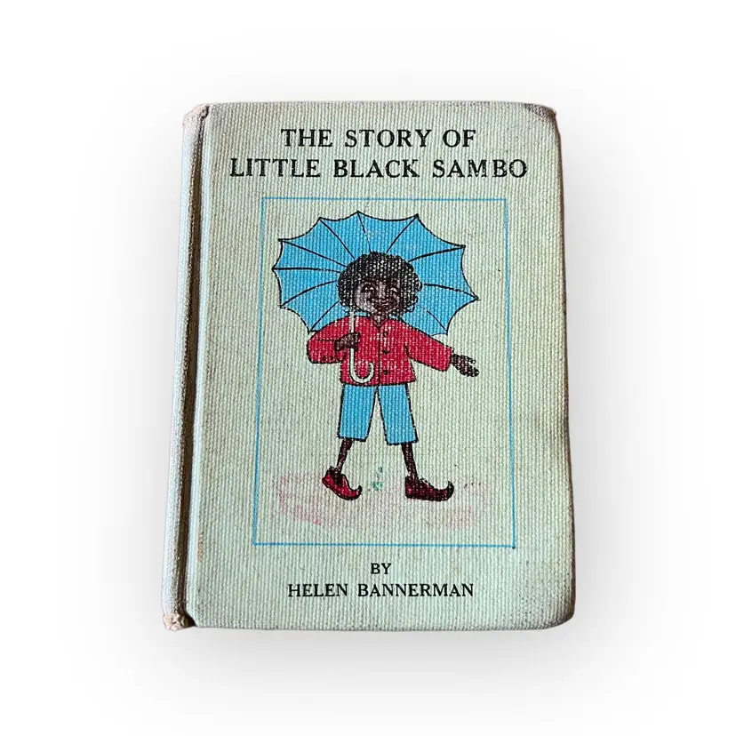 The Story of Little Black Sambo by Helen Bannerman 5.5" x 4" Condition- poor. Wear and fading to cover. Pages are wrinkled and discolored. ex lib book with stamps, marker and other expected writing and flaws.