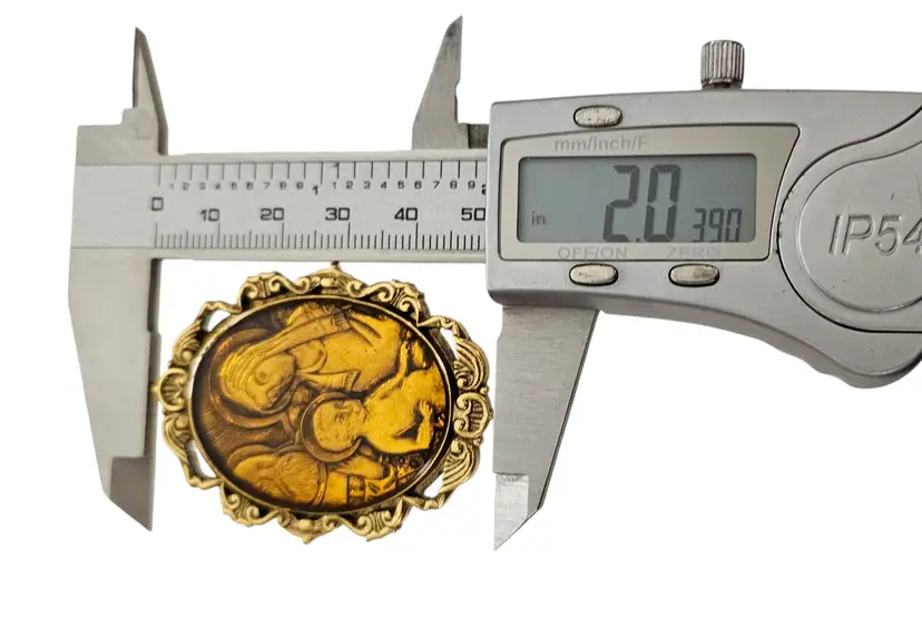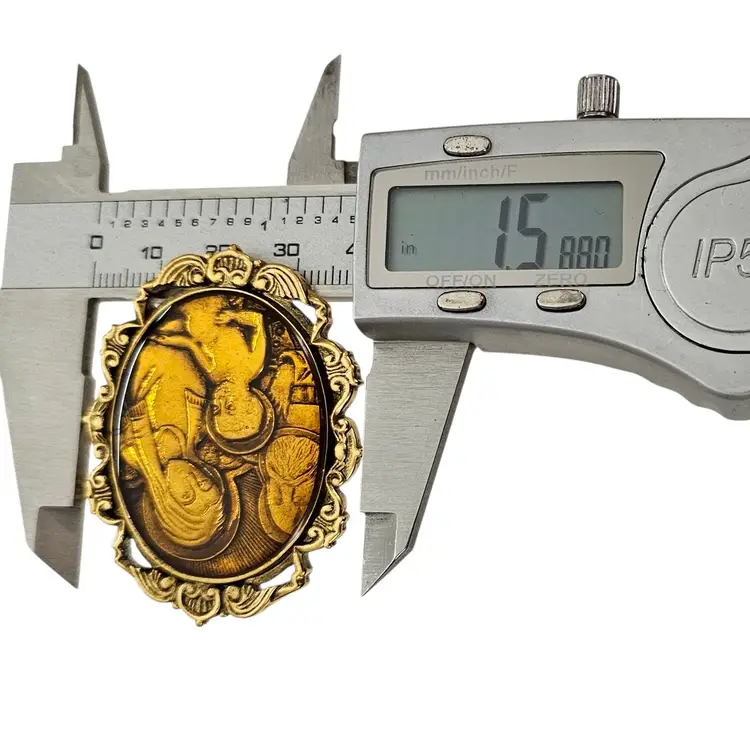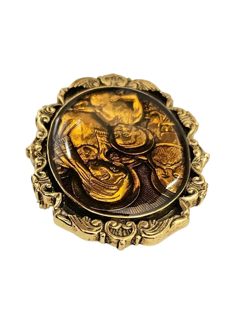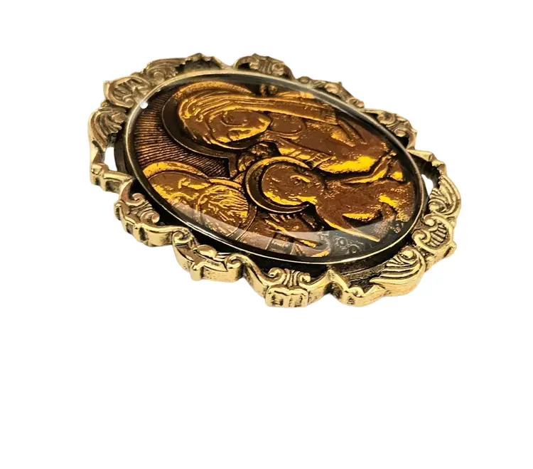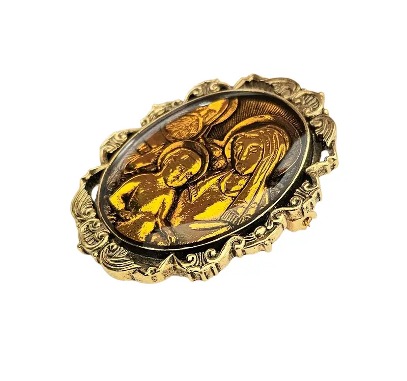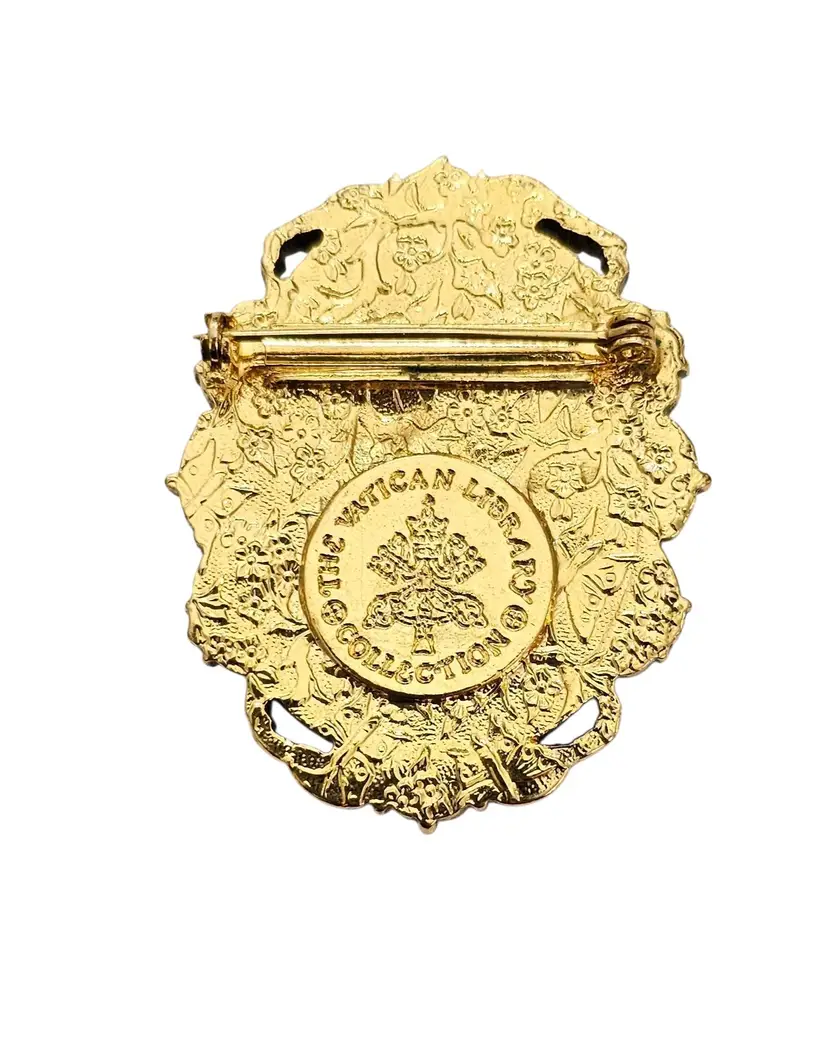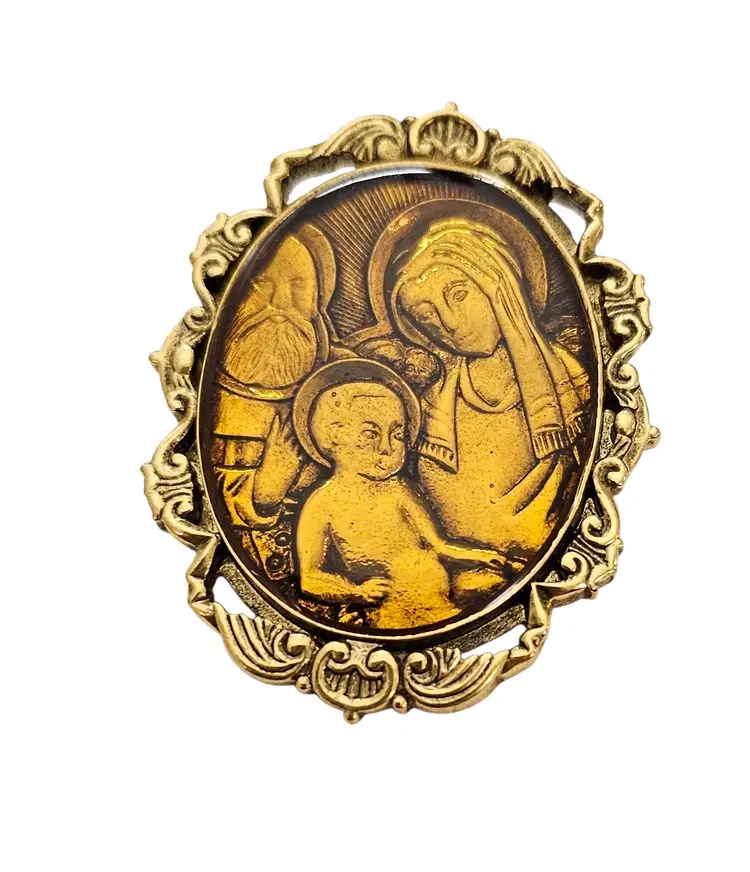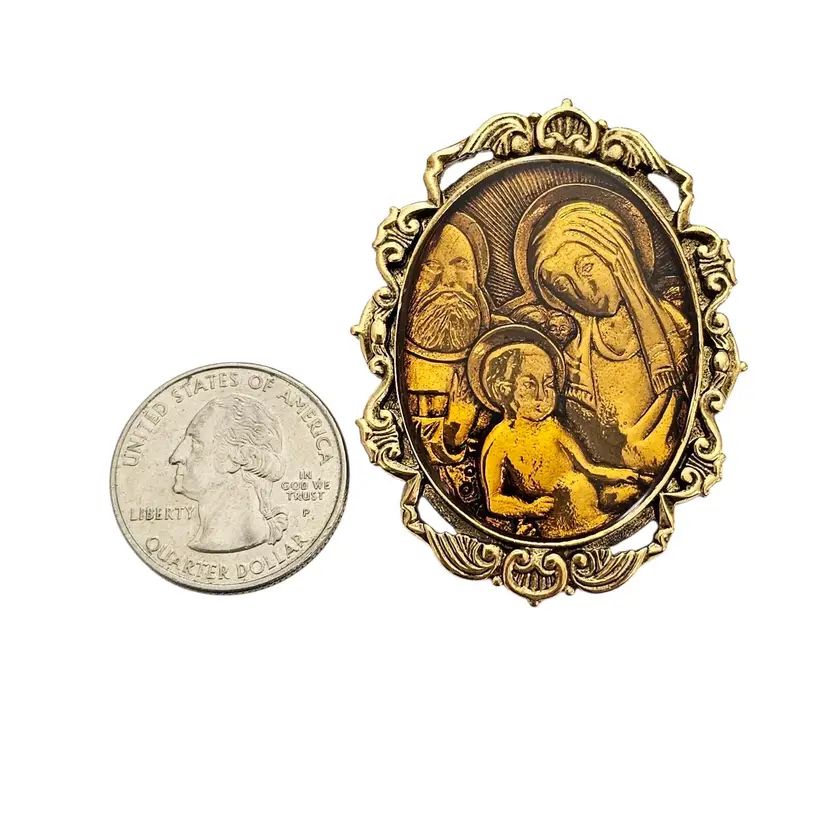 • The Vatican Library Collection Brooch • Religious-inspired costume jewelry • Features Mary, Joseph, And Baby Jesus • Radiant gold tone base frame • With intricate carved borders • Honey-yellow colored glazed resin surface • Etched flora and fauna designed back • It measures approximately 1.6 inches in width and 2.1 inches in length • The back is marked The Vatican Library Collection and a logo at the center of a round cartouche • Good condition • L659