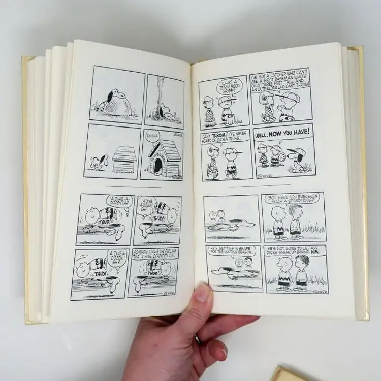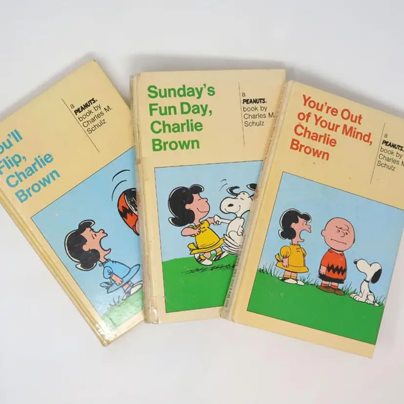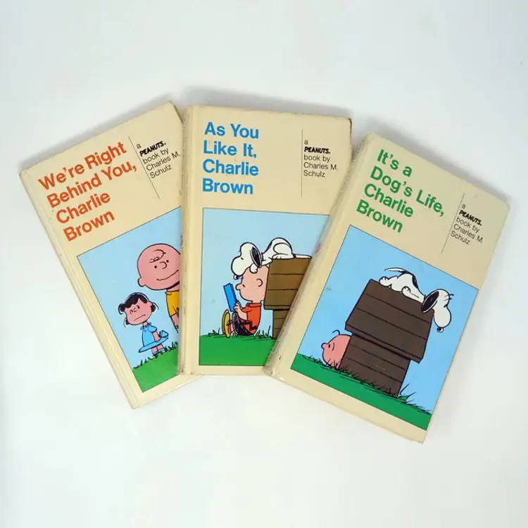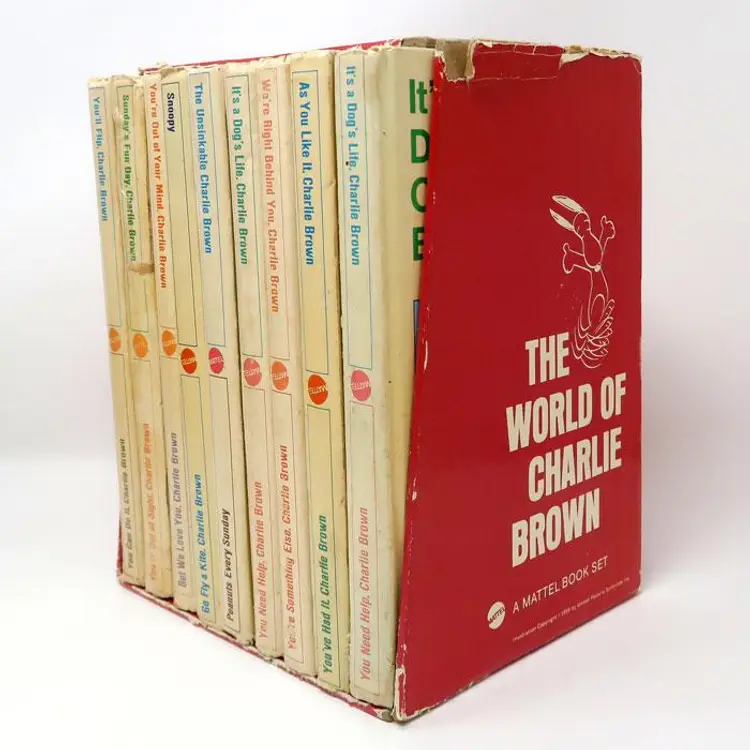 Dive into the world of Charlie Brown with this classic nine-volume book set by Mattel. Each volume contains two book titles and captures the charm and wit of the Peanuts gang. Perfect for any Peanuts fan, this set is a nostalgic treasure. The books come in a sturdy red case for easy storage and display. Made by Mattel in 1979. The set shows heavy signs of use and wear, but is complete.