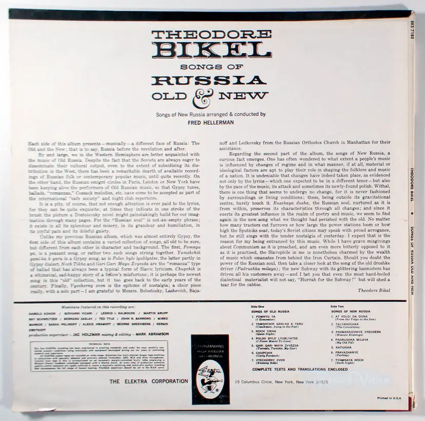 Songs Of Russia Old & New, by Theodore Bikel, is a collection of traditional Russian folk songs blending old classics with newer Soviet-era pieces, performed with passion by the actor-folk singer who brought authenticity through his multilingual talents and expressive delivery. The album features tracks like Pomnyu Ya (I Remember), Yamshchik Gani-Ka K Yaru (Coachman, Away to the Fair), Noch Tikha (Quiet Night), and Polso Bylo Lyublyatse (I Never Meant to Love), highlighting themes of nostalgia, romance, and rural life in Russia. A unique aspect is Bikel's shift from the primarily Gypsy-flavored predecessor to a broader scope incorporating Soviet-specific material, reflecting the Cold War-era interest in Russian culture among Western audiences. It stands historically as a follow-up to his breakthrough Songs of a Russian Gypsy, which had been a major success for both artist and label, prompting this quicker sequel to capitalize on that momentum. Fan-favorites often include the evocative storytelling songs that showcase his dramatic vocal style. The album itself was a hit for Elektra Records in the folk scene.