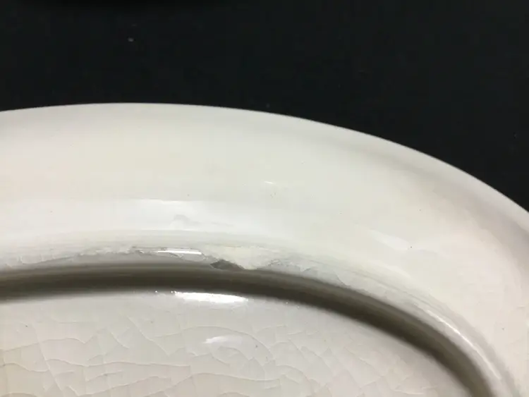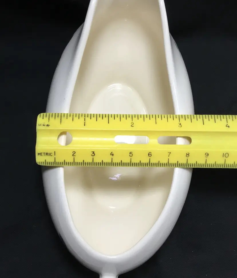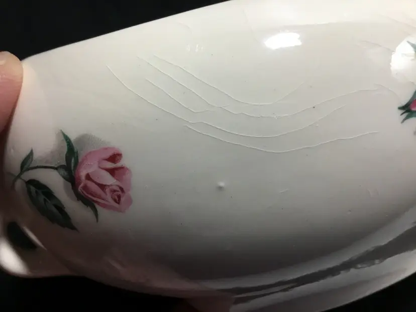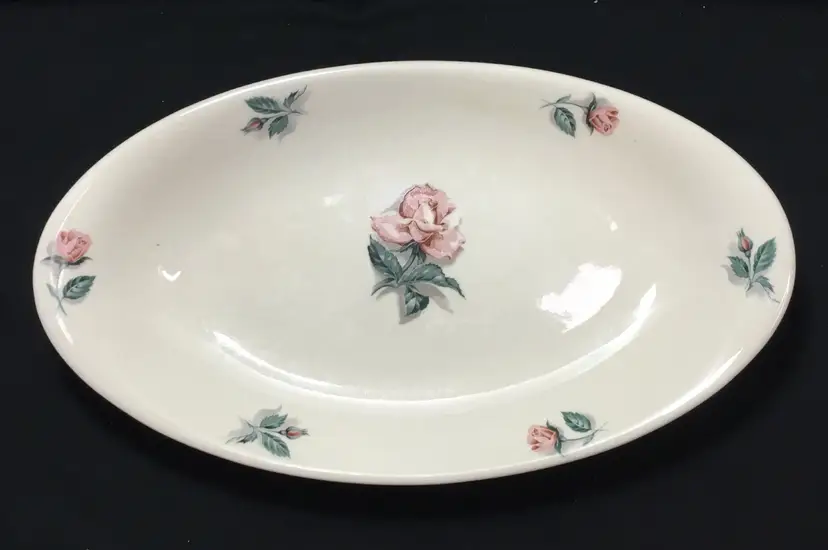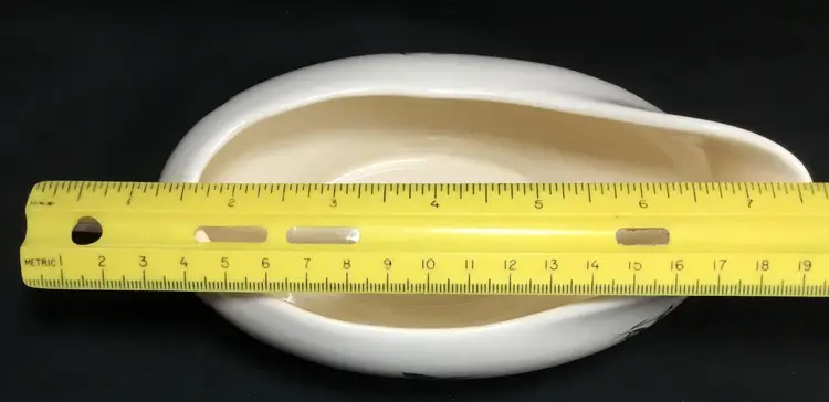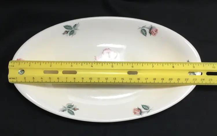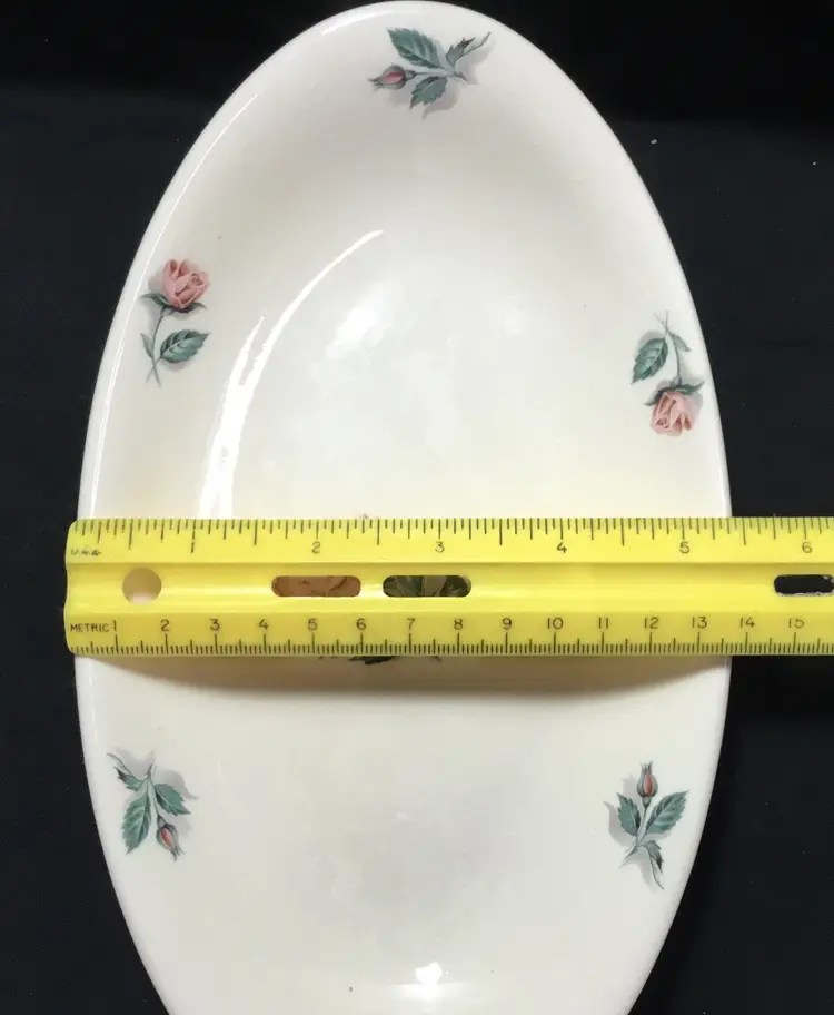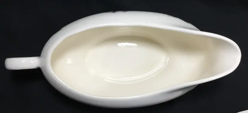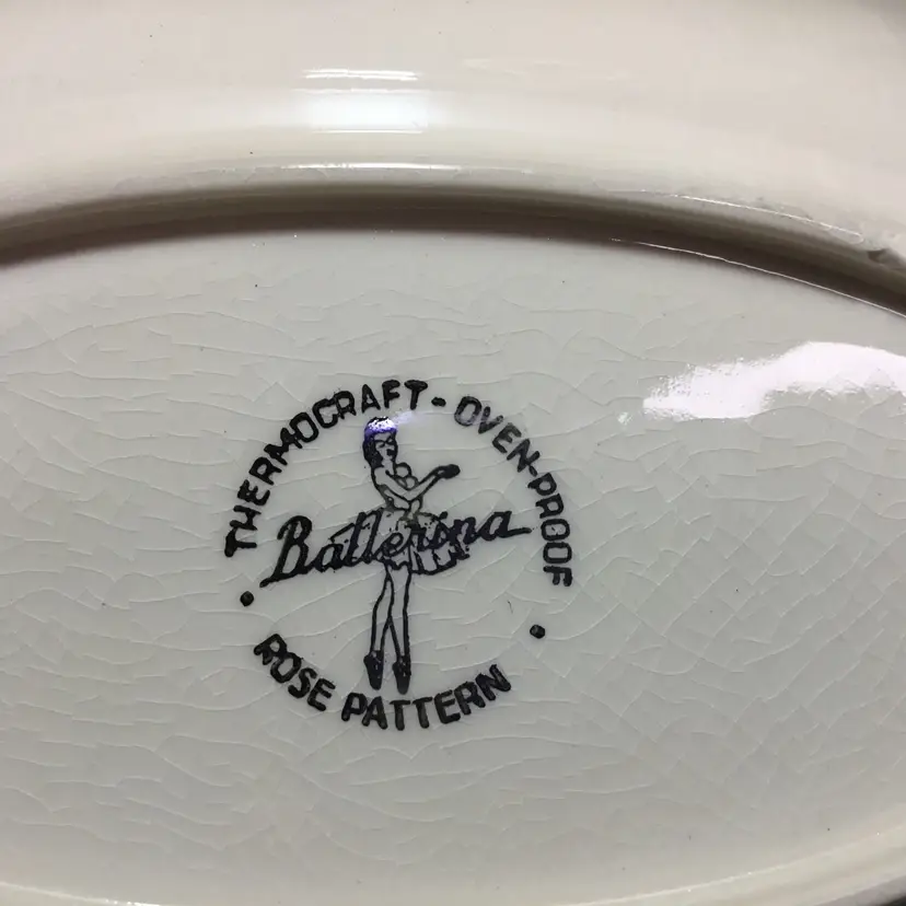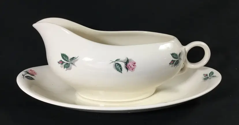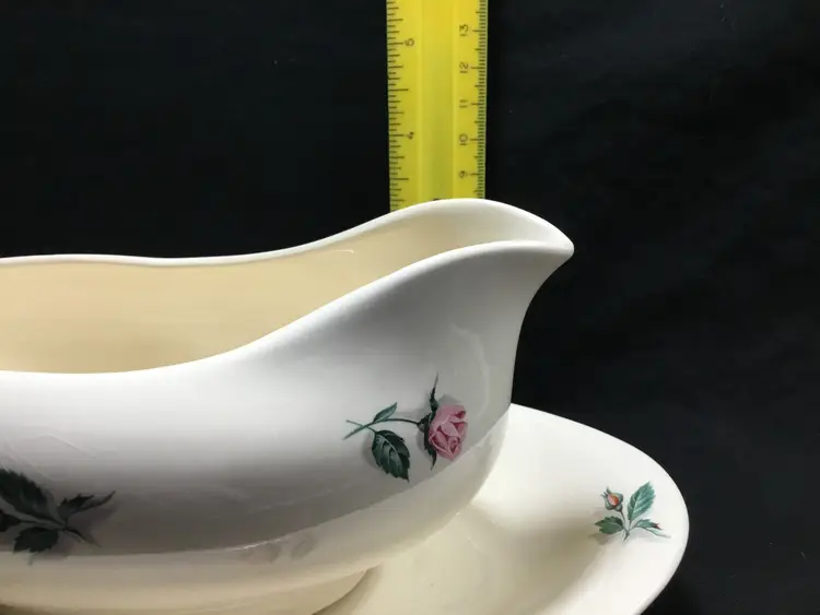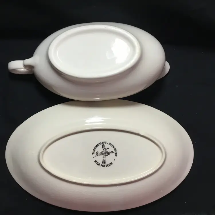 Thermocraft Ballerina gravy boat set, set is approx. 3.5 inches tall at spout, boat has 3 rosebuds on each side, is 7.5 inches from handle to spout, 3.25 inches wide at widest part. Holds 1.5 cups liquid. Tray has large, pink central rose, 6 rosebuds around edges. 9.5 inches long, 5.5 inches wide. Tray's glaze is very crazed, small chip on foot of tray. Boat's glaze is beginning to craze. See all photos.
