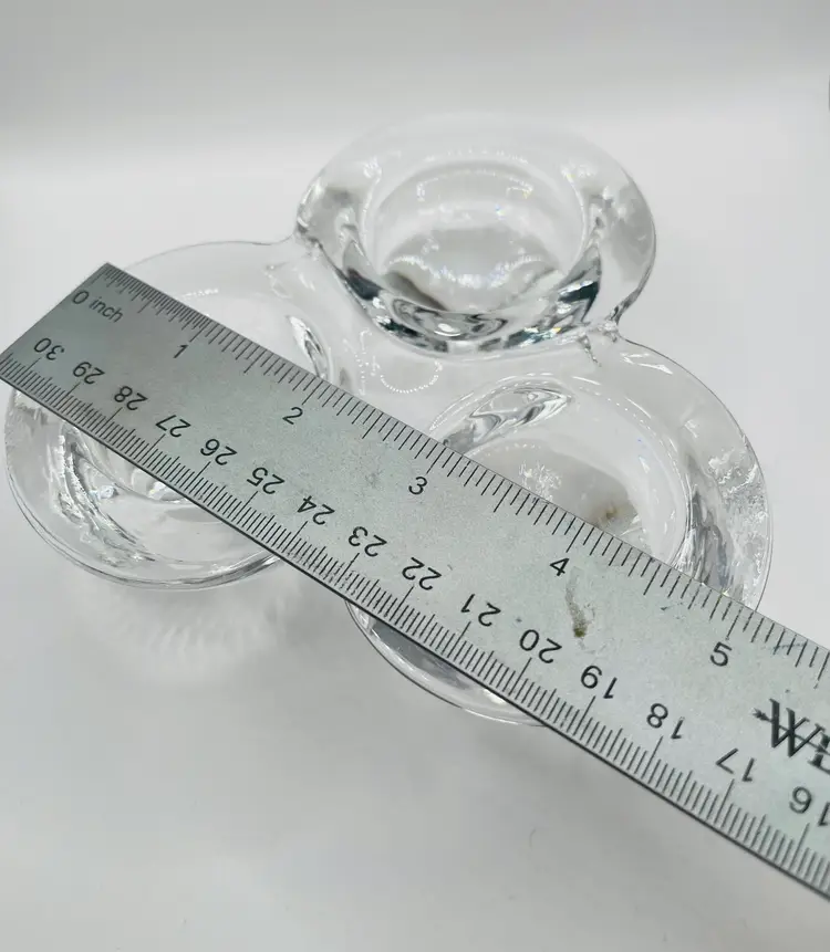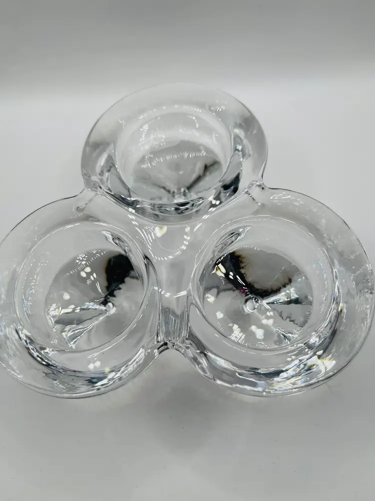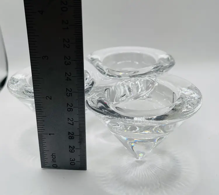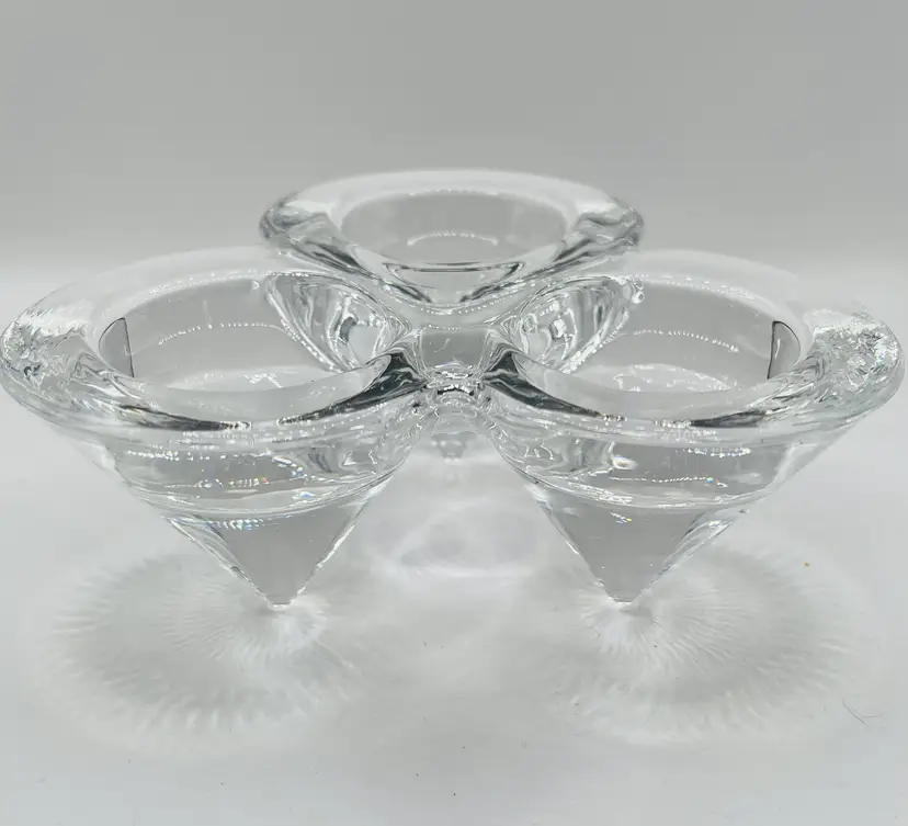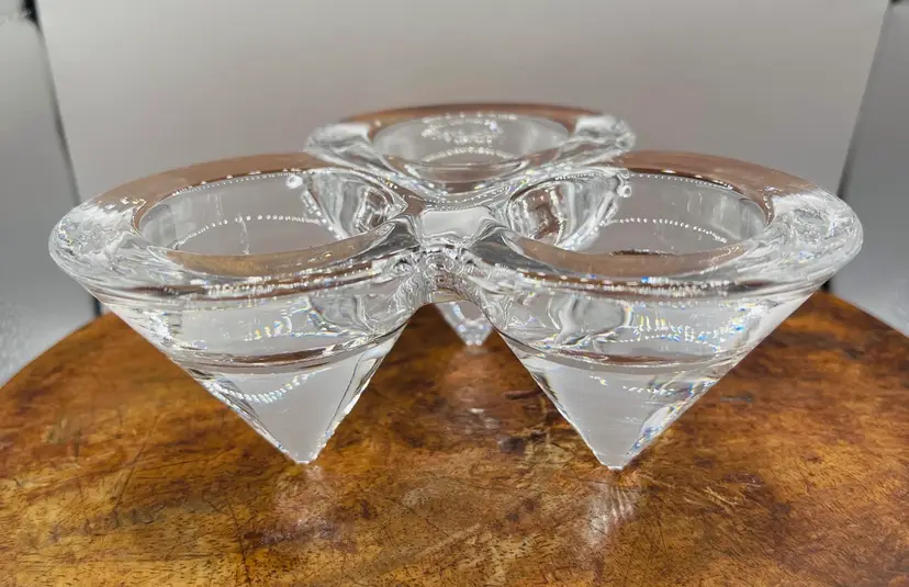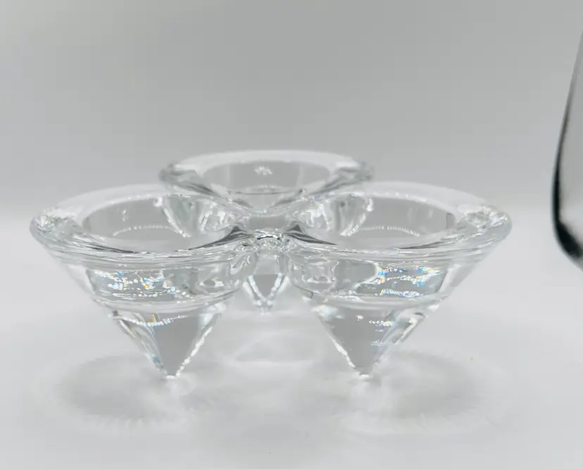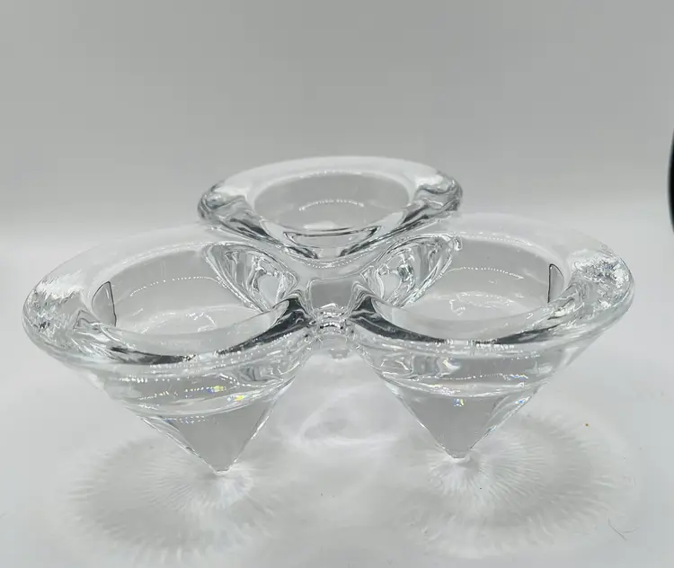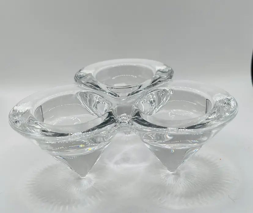Thick Inverted Cone Shaped, Tri-Angular Pattern & Connected Clear Glass Tea Light Candle Holders, One Solid Piece, Very Decorative Made by Dorre Crystal of Sweden Smooth crystal is gorgeous- LOTS of rainbows when you show it to the light 6.25 by 6.25" 2" high Scandinavian art glass candle holder is gorgeous! Excellent condition no chips or cracks
