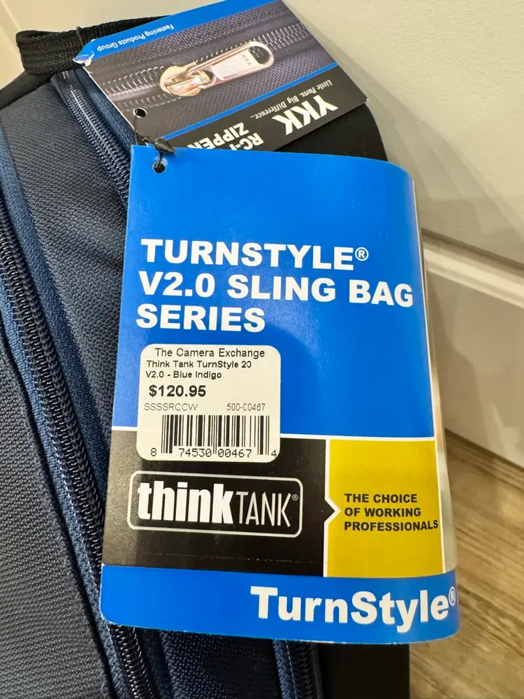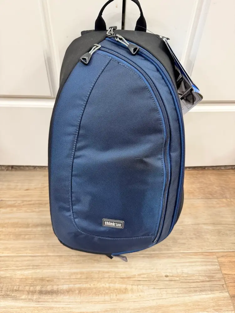 I’m selling a brand new with tags Think Tank TurnStyle V2.0 Sling Bag in blue and black. Shortly after purchasing it, I realized that my camera setup and accessories were too large for this bag, so I had to go with a different option.