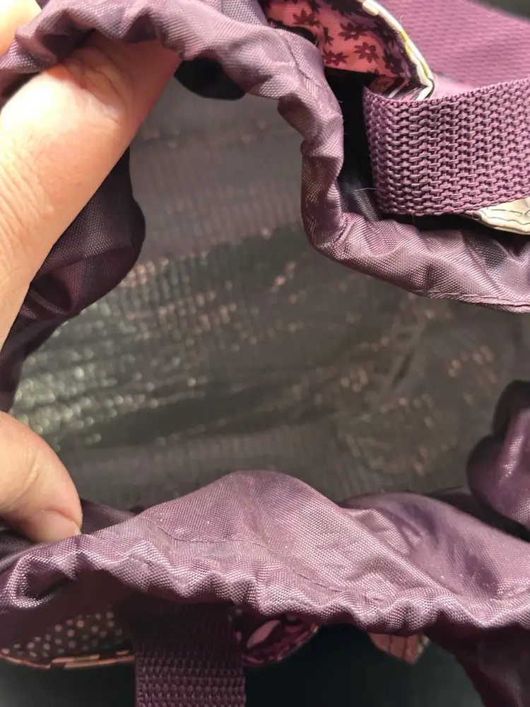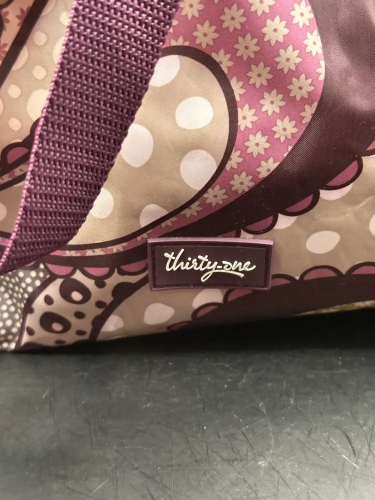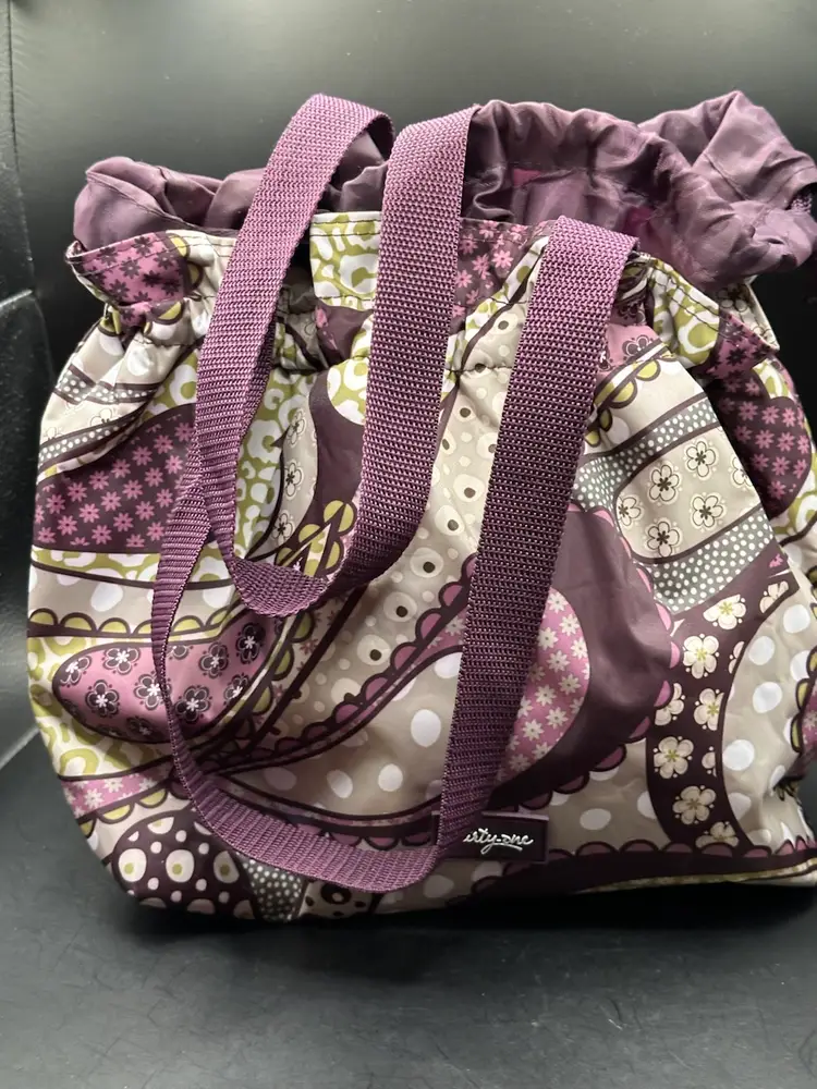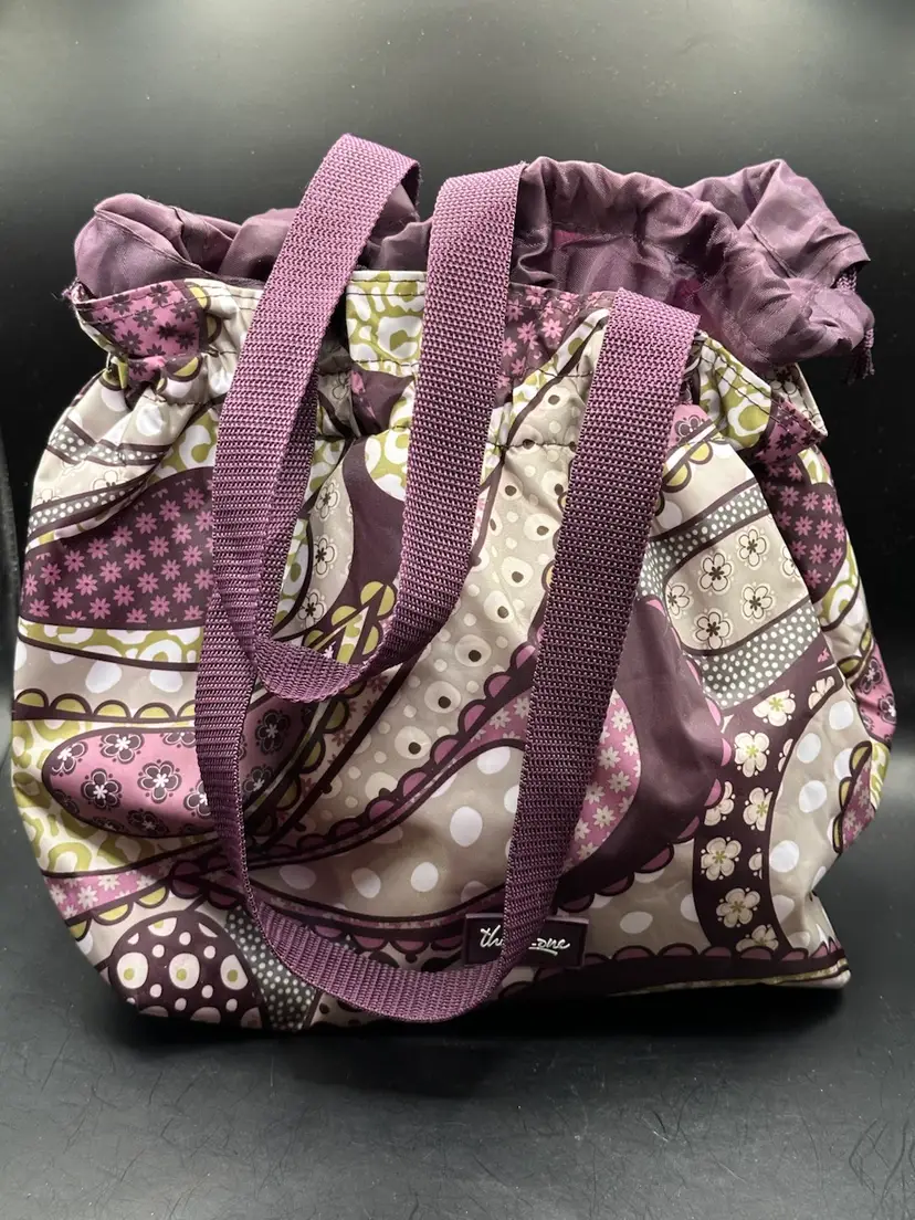 Thirty-One Thermal Cinch-Top Lunch Tote, featuring a purple paisley pattern.