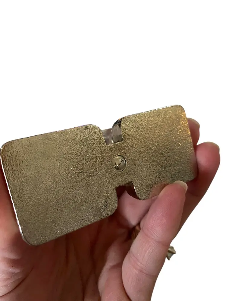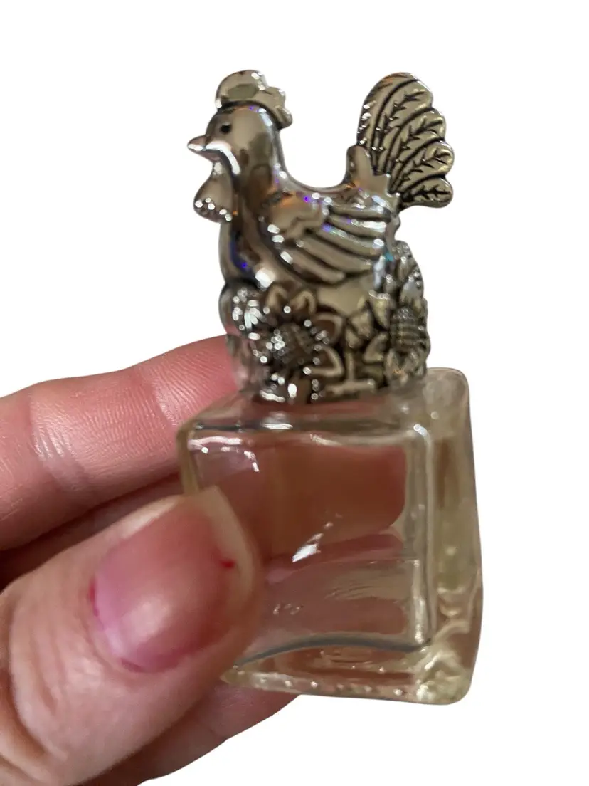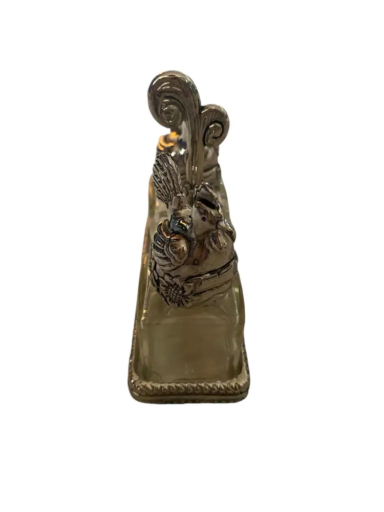 This is a Thomas Leiblein (or Godinger) silver-plated and crystal chicken salt and pepper shaker set with a carrier, possibly part of the "Fox in the Henhouse" collection