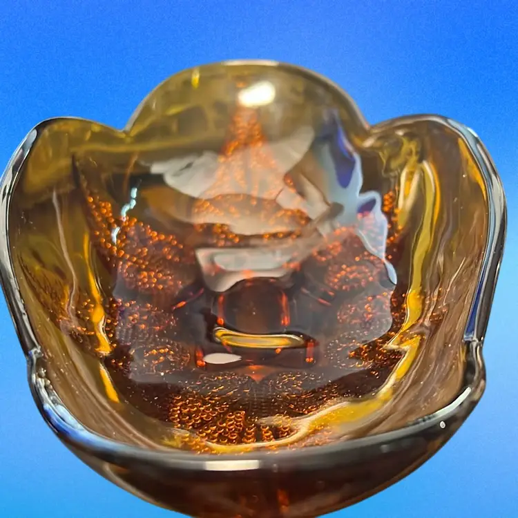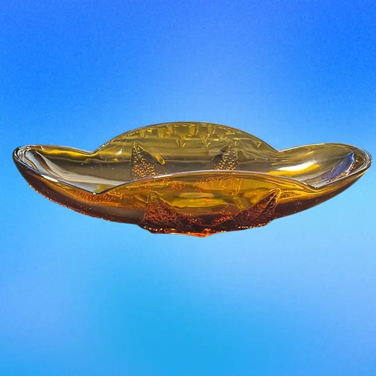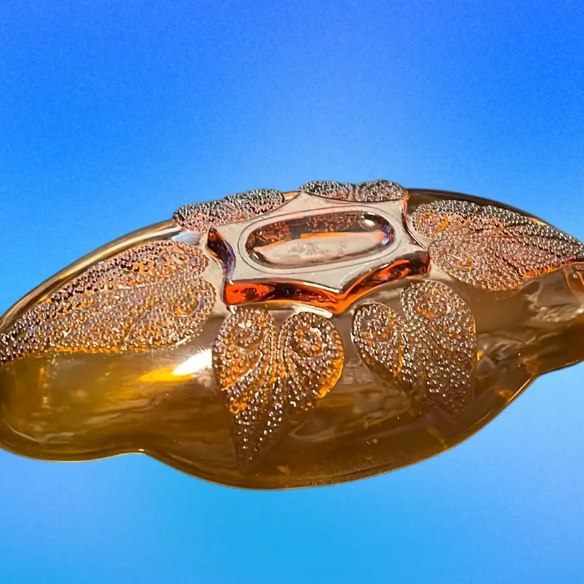 This is a vintage Anchor Hocking Renaissance Leaf Amber Glass Oval Relish Trinket Candy Dish Fall Halloween Carnival 10x5”