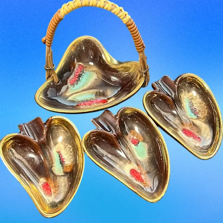 Bay Keramik was a West German pottery company founded in 1933 by Bodo and Elfriede Manss. The company was known for its innovative designs and high-quality ceramic products, particularly during the mid-20th century. No condition issues. Set includes the base and 3 ashtrays.