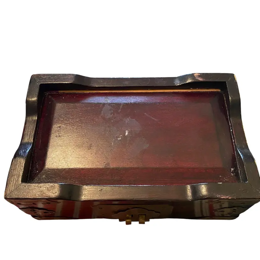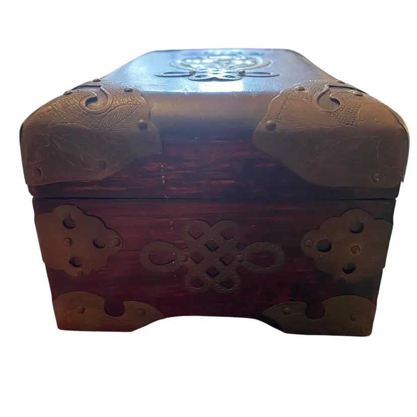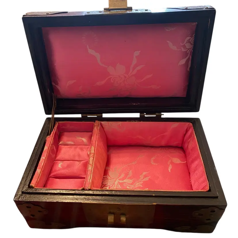 This is a vintage Chinese rosewood jewelry box with a jade inlay and brass hardware 6.5x4