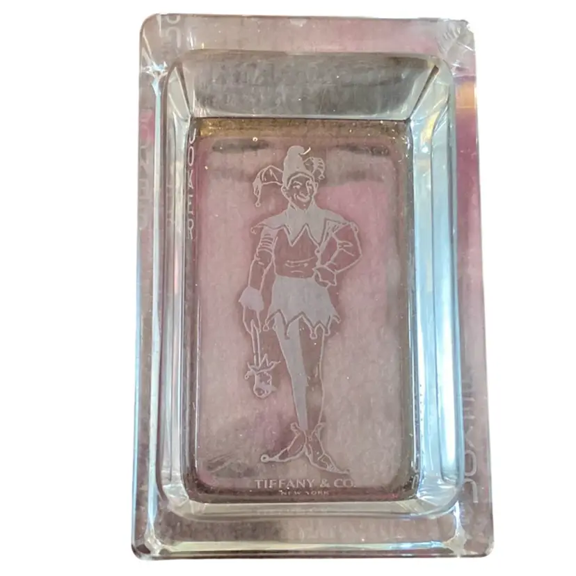 This is a vintage Tiffany & Co. crystal ashtray or paperweight featuring an etched Joker design . Trinket dish mab cave