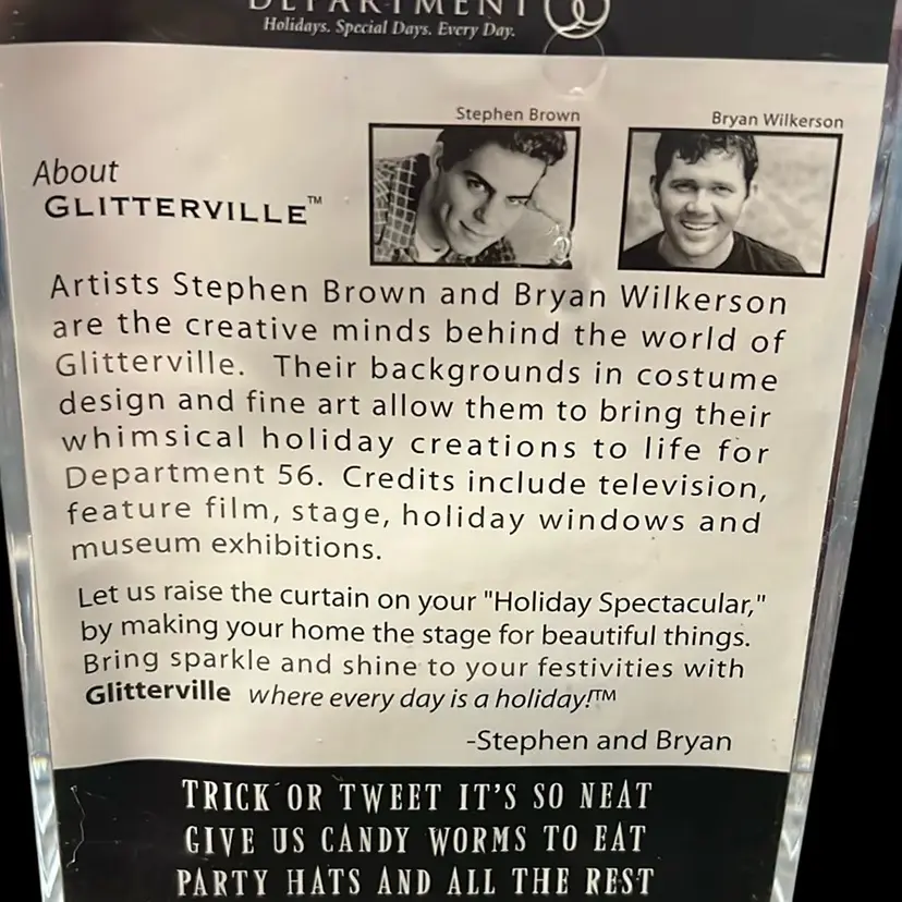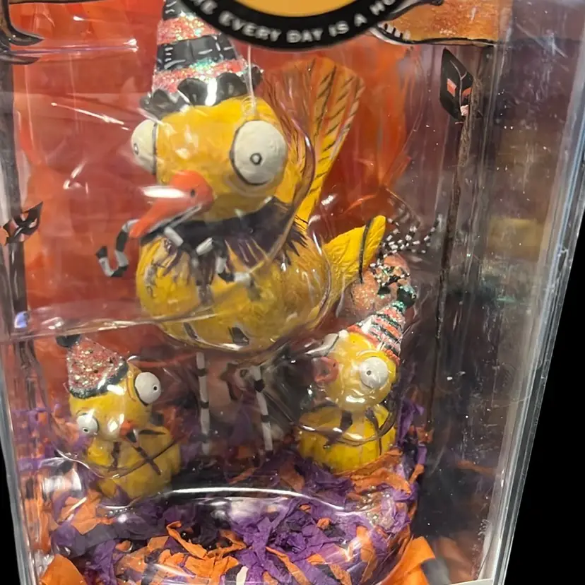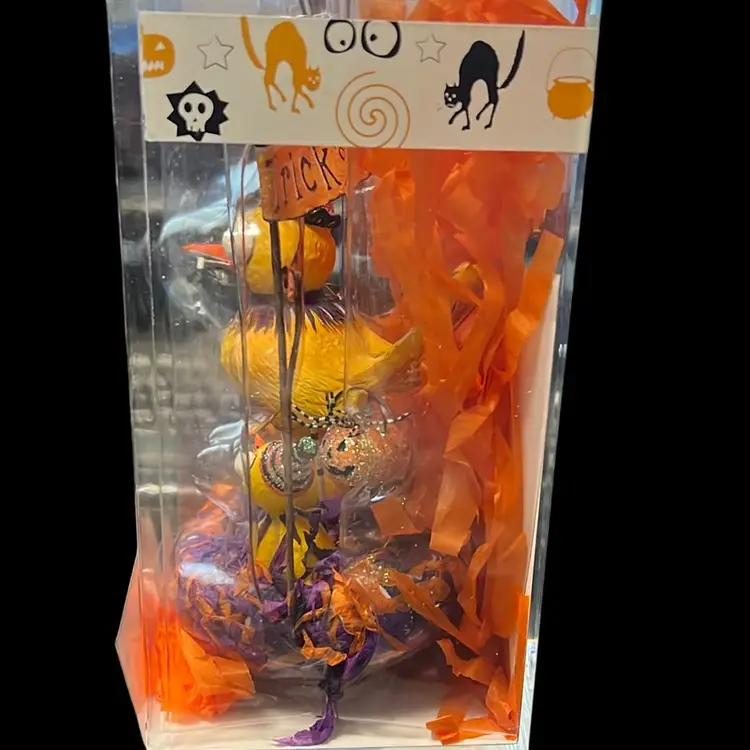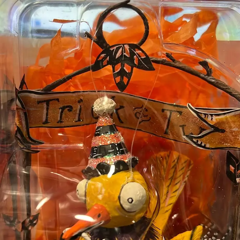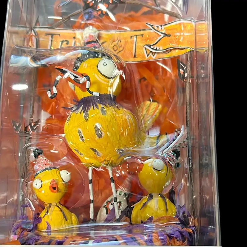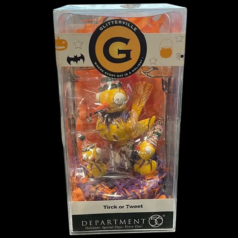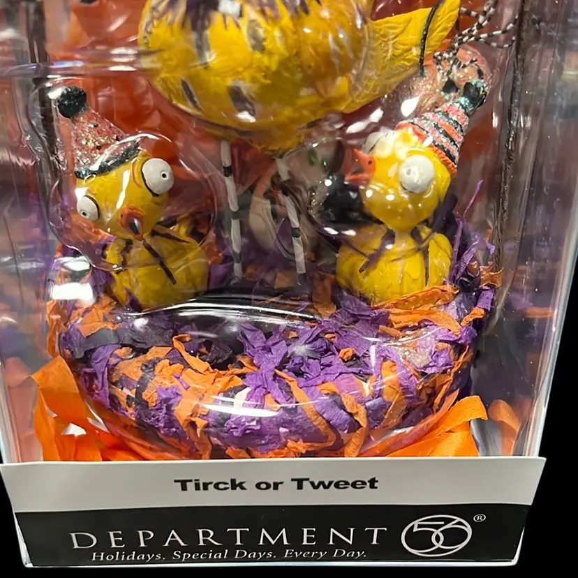 This is an adorable Dept 56 Glitterville Halloween decoration. It has 3 birds sitting in a nest with a sign behind it that says, "Trick or Tweet."