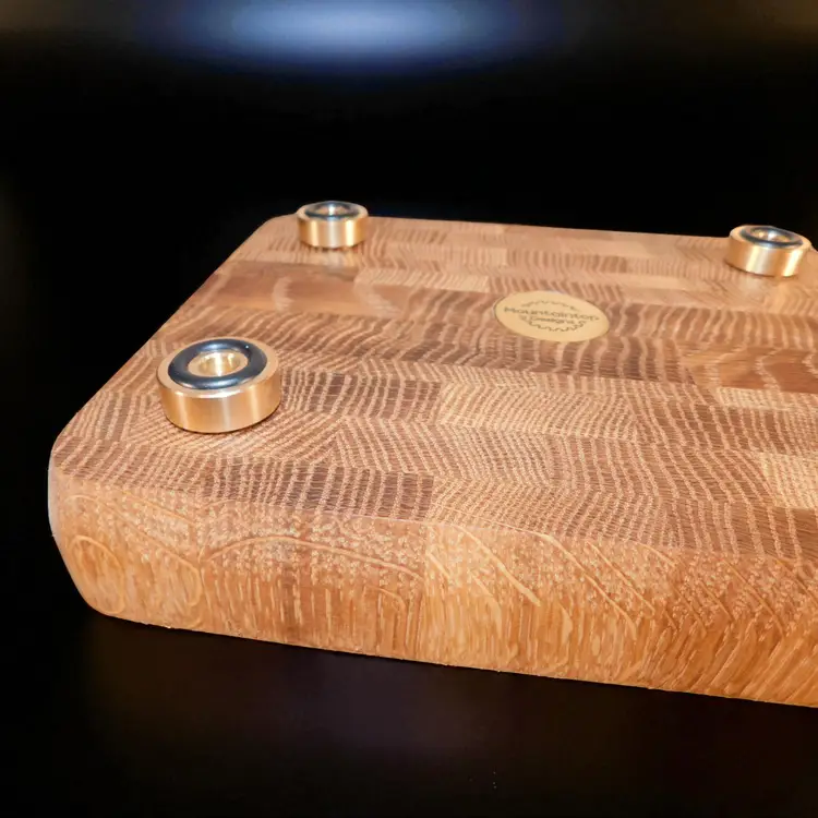 This end grain cutting board is made of locally sourced solid White Oak wood. The inlay is plated with 24 karat gold and is sealed to be food safe. Since this board is 100% solid end grain, it will preserve the life of your knives while maintaining a beautiful cutting surface. This board is soaked overnight in a mineral oil bath, and is waxed after with a food safe wax.