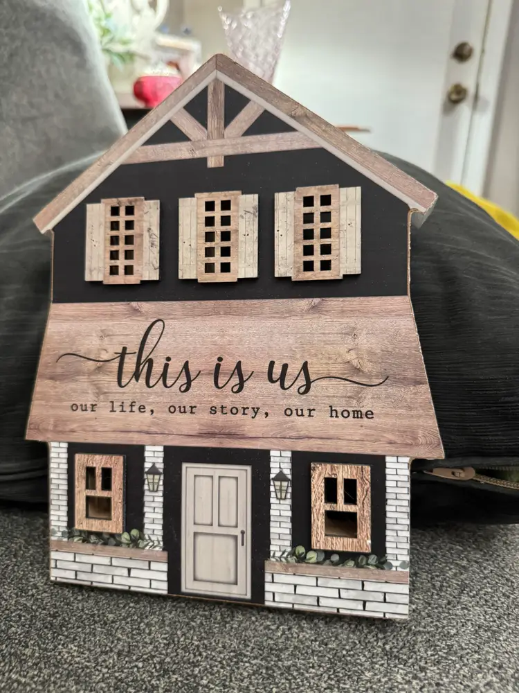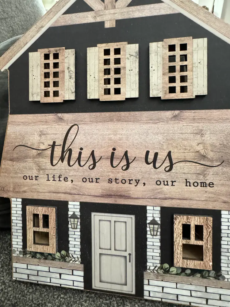 Pretty "This is Us, our life, our story, our home" wooden plaque. Farmhouse Decor. Can stand alone or can easily be hung on a wall. 7 1/2" X 10"