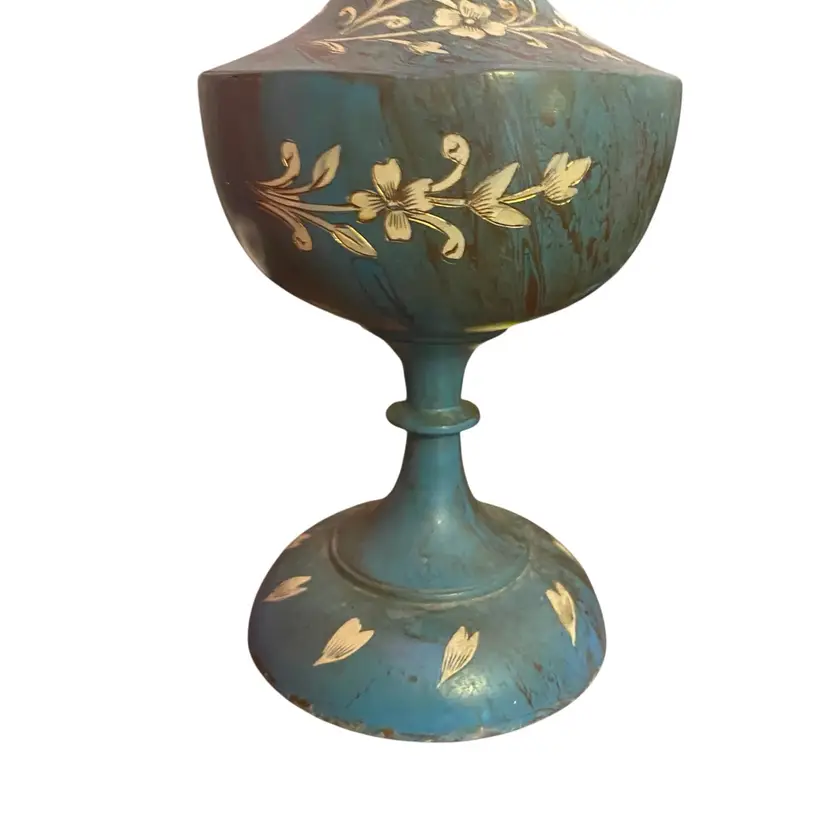 This item is a vintage Israel tin and brass ewer, featuring a blue enamel finish with gold-toned floral accents and a unique tall handle