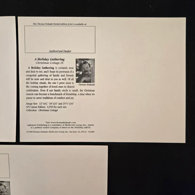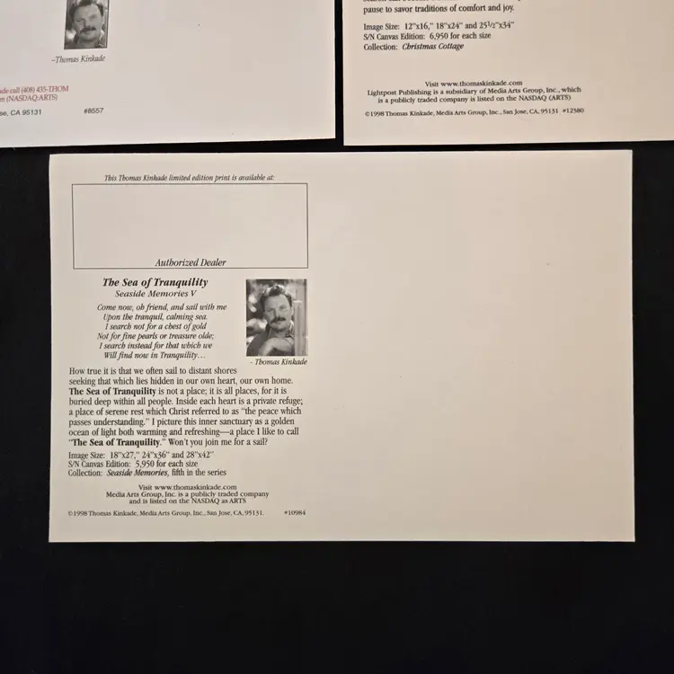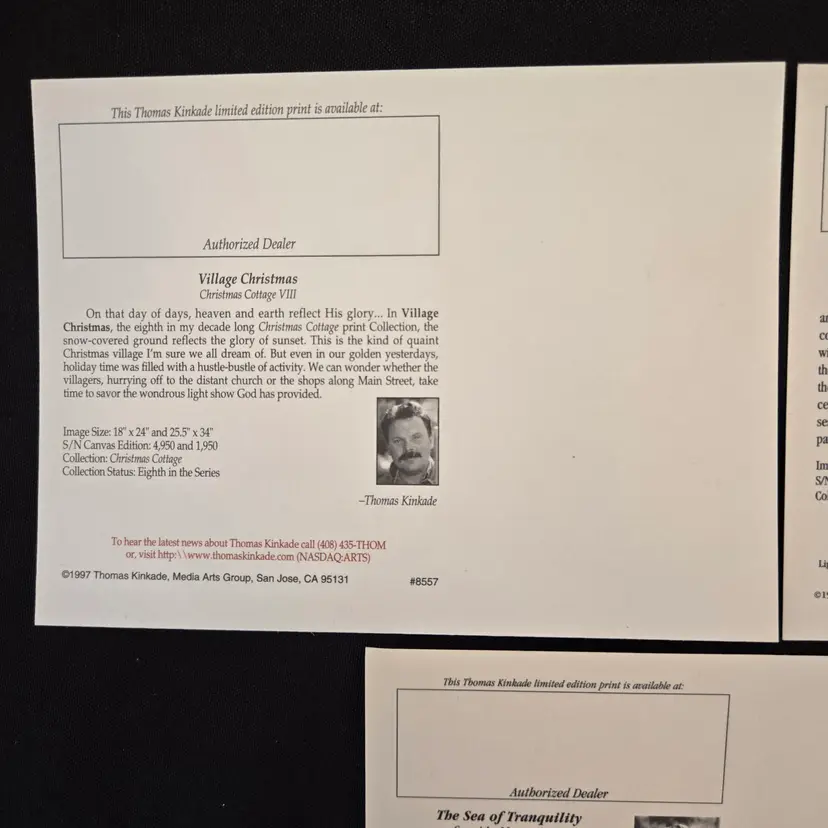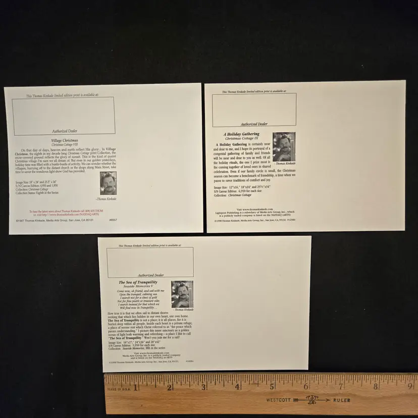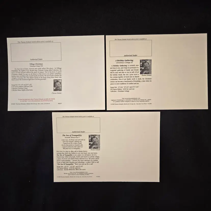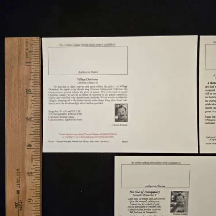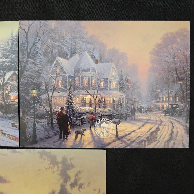 Thomas Kinkade Dealer Promo Postcards - set of 3 - Village Christmas, A Holiday Gathering & The Sea Of Tranquility Vintage (1997-1998). Used condition in plastic sleeves with small bumps to some corners, slightest bit of yellowing to backside. Please view all the photos and please ask any questions prior to purchase when possible. NOTE: color rendition may differ slightly between the item description photos and the item received if purchased due to lighting conditions.
