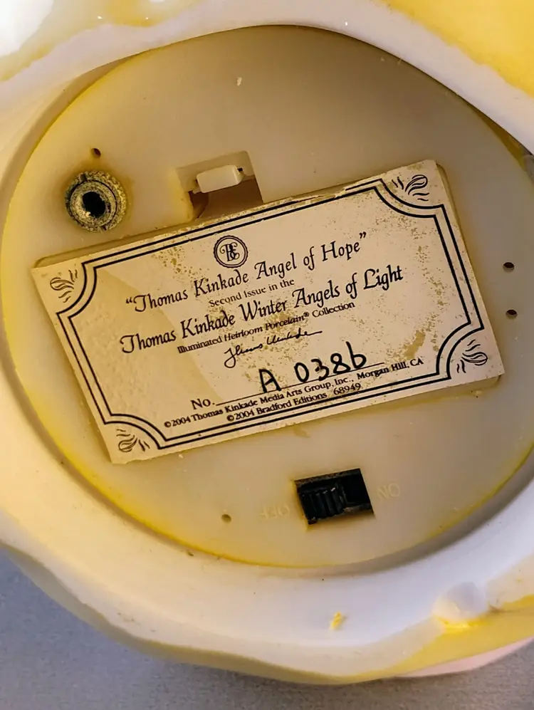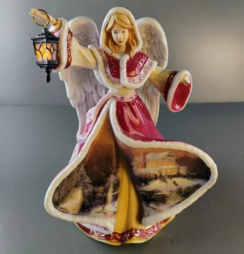 This listing is for a Thomas Kinkade Porcelain Angel Of Hope from the Winter Angels Of Light Collection. Her lantern works but please note that her left hand is missing. Other than that, no damage.