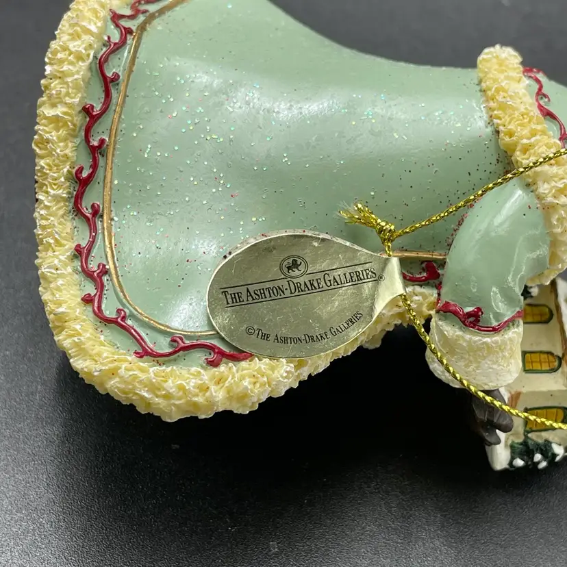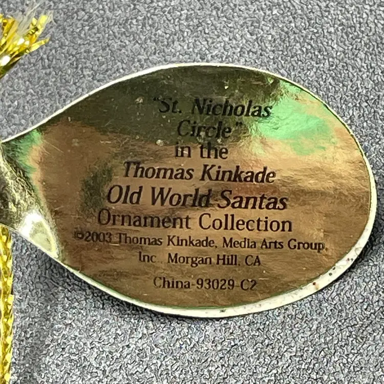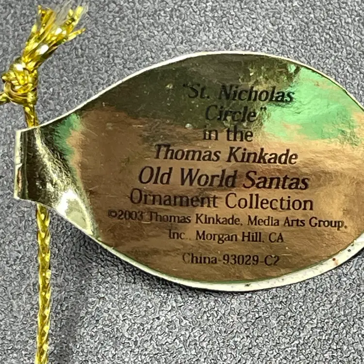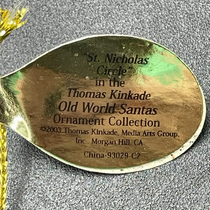 This is a vintage 2003 Thomas Kinkade for Ashton-Drake Galleries Old World Santa St. Nicolas Circle hanging ornament with its original label. Measures approximately 4" tall x 3" wide. No major flaws.