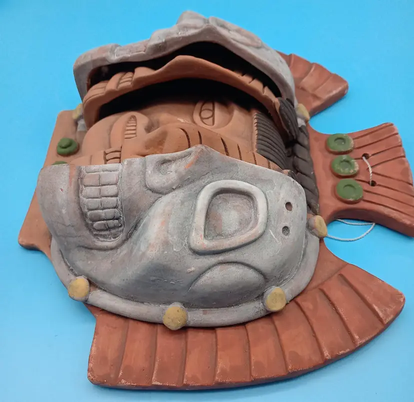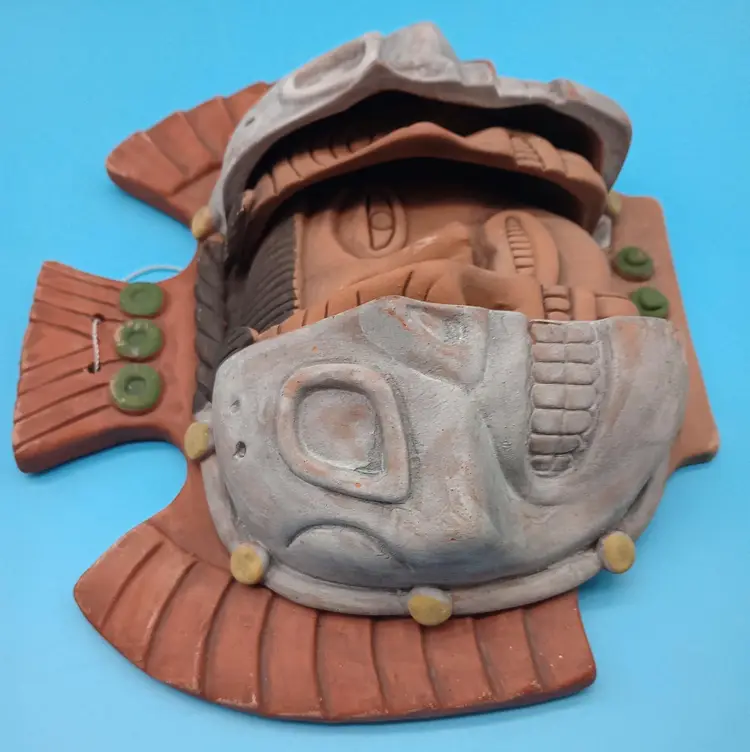 This Vintage Aztec mask is called The Ages of Man. This Marked art pottery wall hanging, depicts the life of man from youth through the geriatric years of life. It would make an excellent addition to anyone's collection of art pottery. This piece measures 9 inches tall by 10 inches wide. The mask weighs approximately 3 lbs and is waiting just for you.