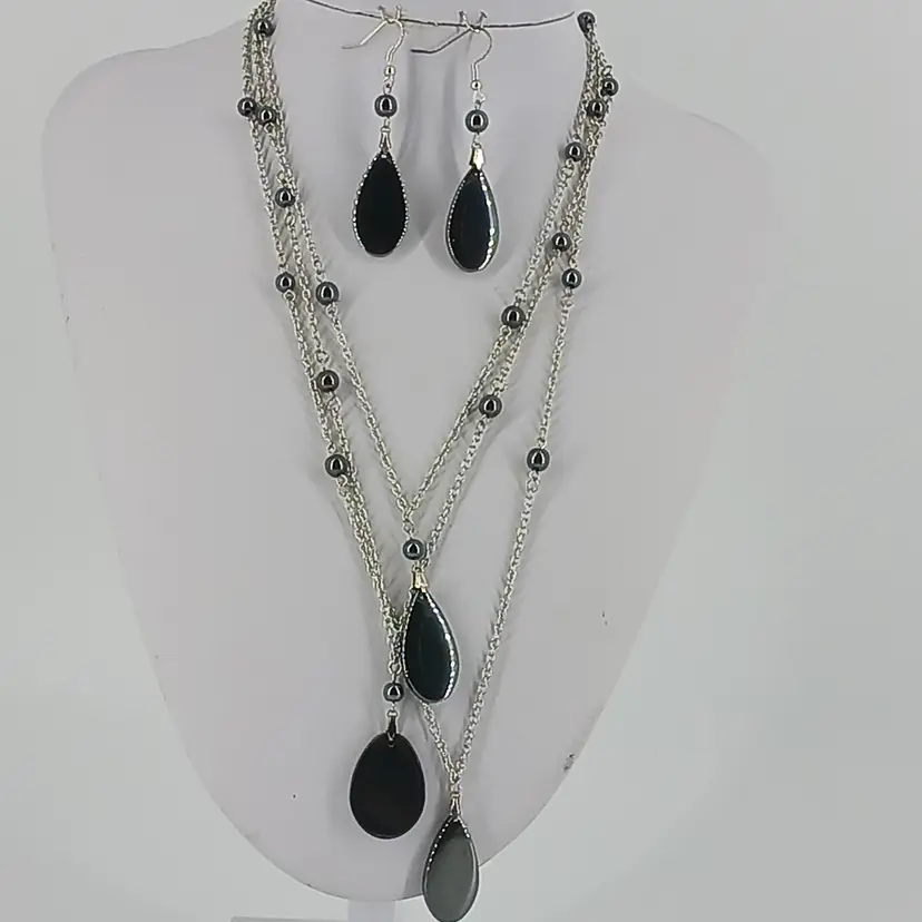 NMLot38 - Non Magnetic Hematite drop pendant stones that measure 9/16 x 1 1/8 x 1/8 inch along with ¼ inch Round Hematite beads hang from Stainless Steel French Earring Wires. These match the Bib Necklace made up of same size stones as earrings but have one ¾ x 1 x 1/8 inch Non Magnetic Hematite Pendant bead with Japanese Emblem on front. Three rows of stainless steel chain make up body of bib to make this 17 inch necklace with 3 inch extension chain for extra length.