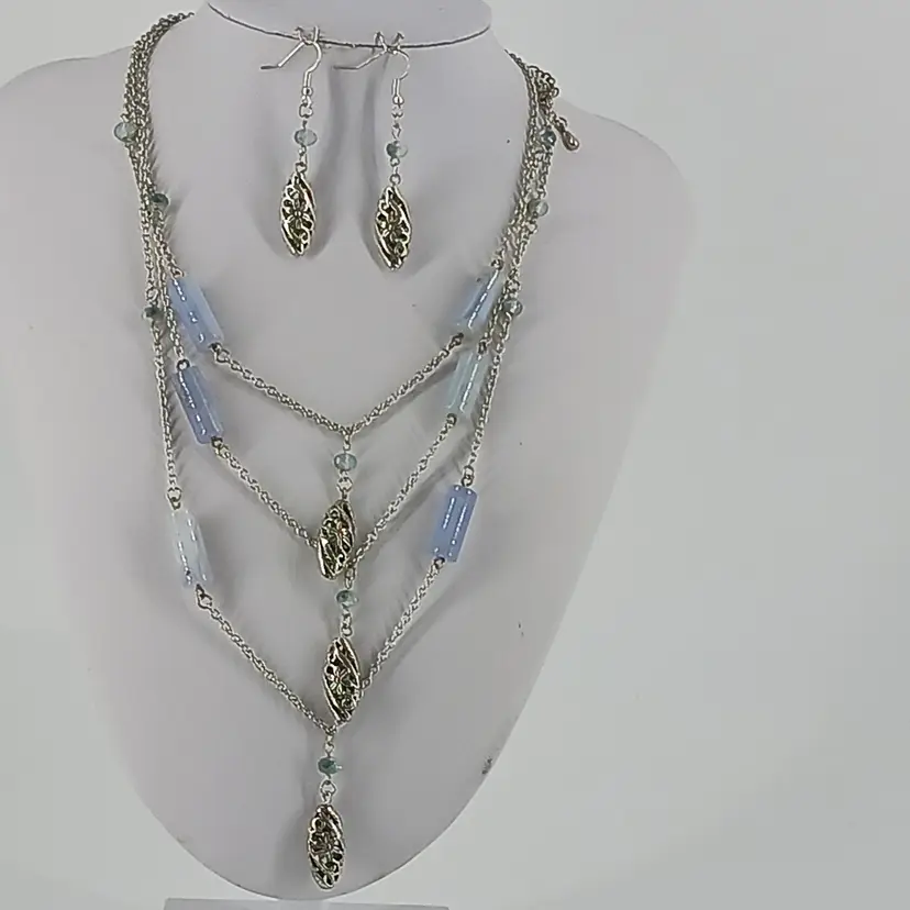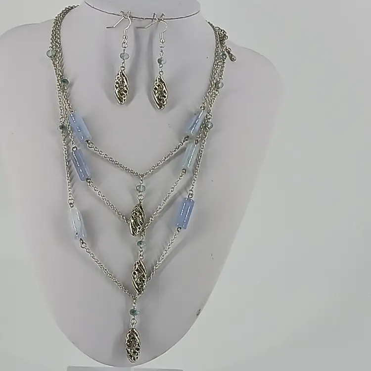 This set is made up of Chalcedony Gemstone beads that measure 5/16 x 13/16 inches along with Tibetan Silver drop beads that measure 3/8 x 5/16 x 7/8 inch and 3/16 x ¼ inch faceted iridescent beads that make this Bib necklace that is 17-18 inches with 2 inch extension chain and comes with matching earrings.