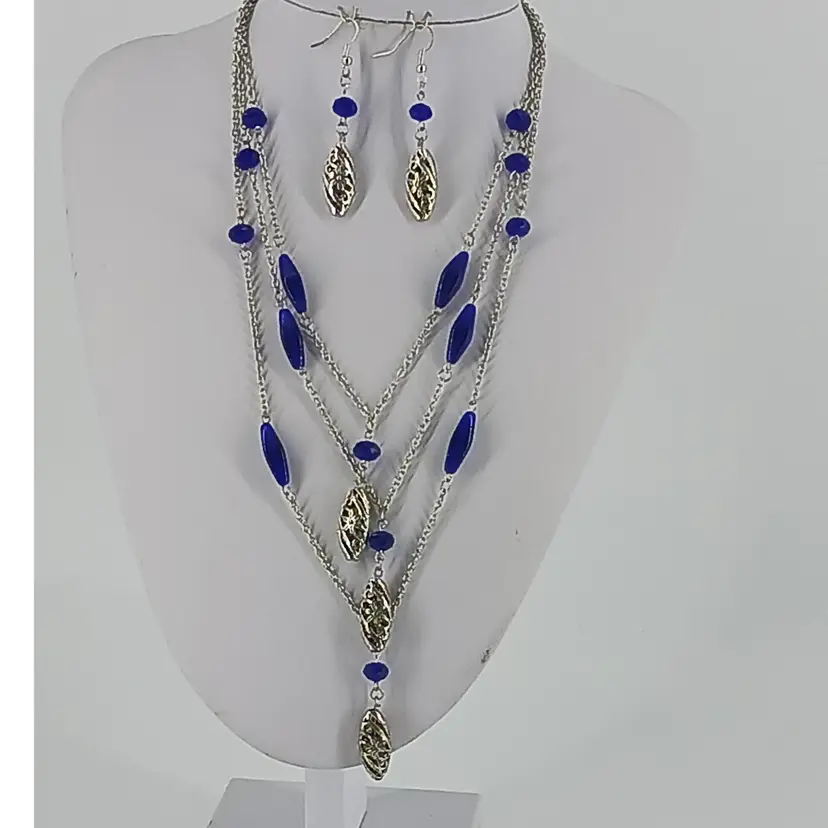 Royal Blue Faceted Glass beads that measure ¼ x 5/16 inch glass beads and Tibetan Silver drop beads that measure 3/8 x 5/16 x 7/8 inch and drop and glass beads ¼ x 7/8 x ¼ inch linked beads to make up this Bib necklace that is 19 inches long with 2 inch extension chain. Matching earrings included.
