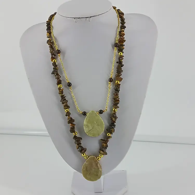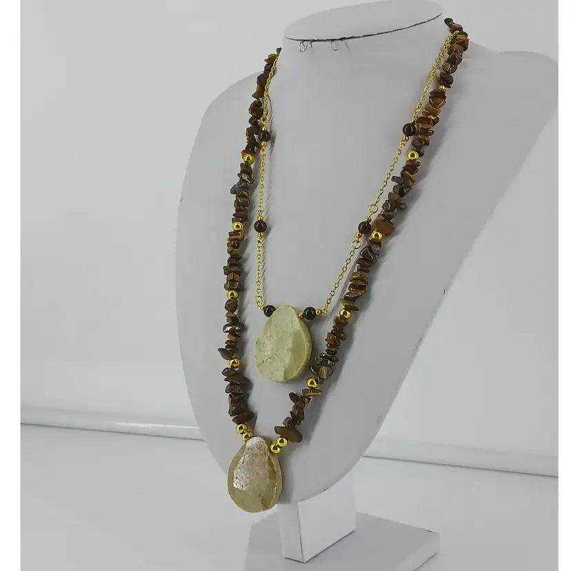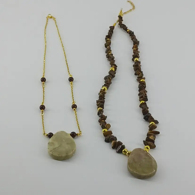 Qty 2 - NM875 – A carved 1 7/16 x 1 1/8 x 1/4inch beige Soapstone is strung with 3/16 and 1/8 inch gold plated beads that help separated chips of Tiger Eye Gem Stone beads to make this 22 1/2 inch necklace. A 3 inch gold plated extension chain has been added for extra length