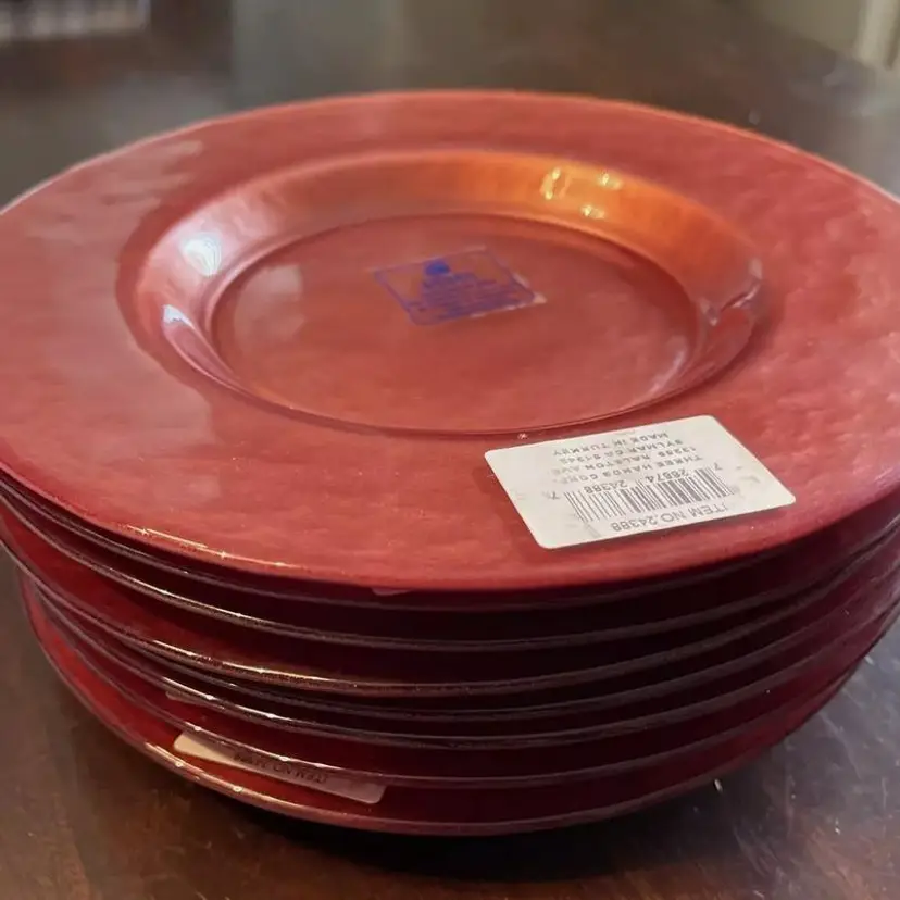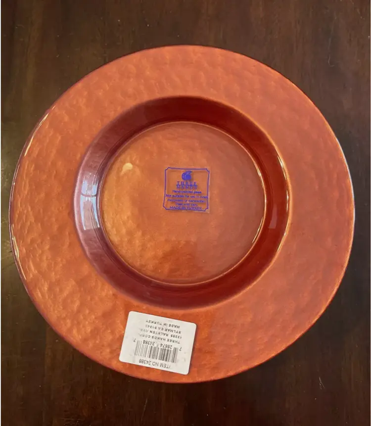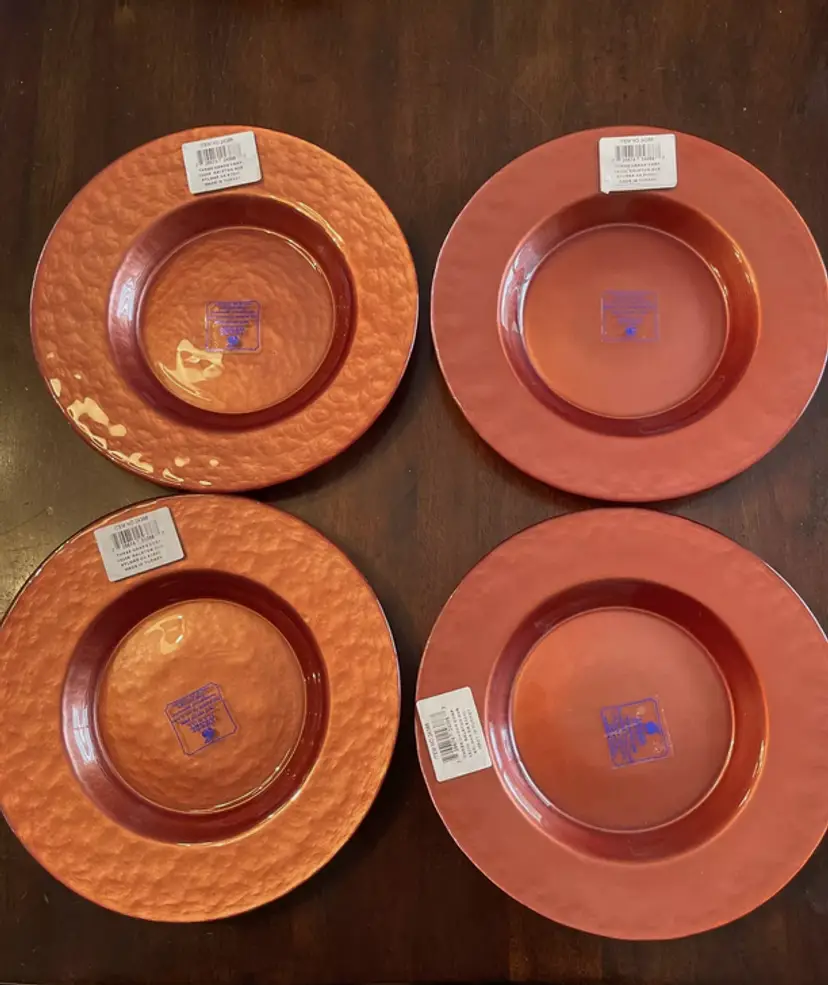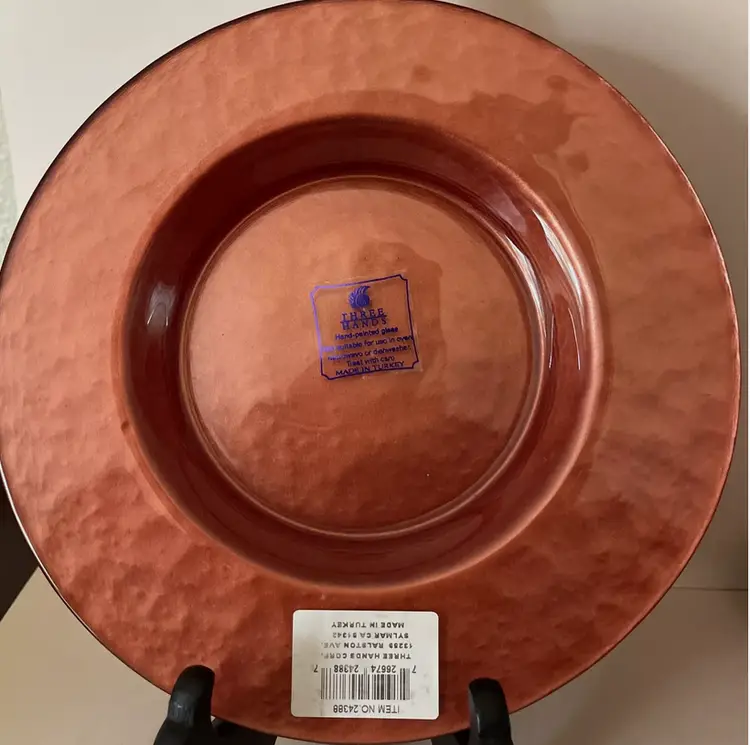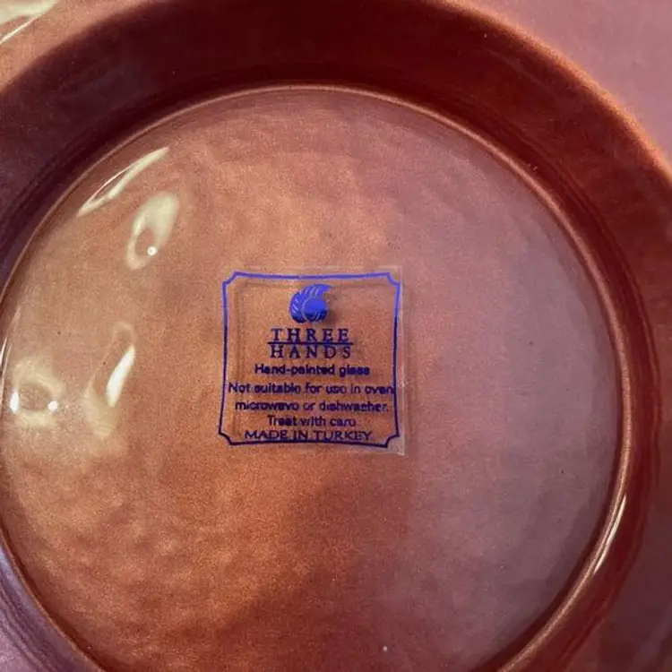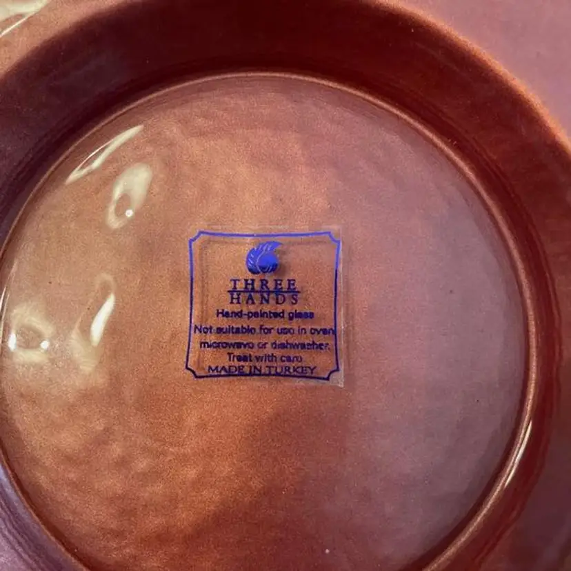 Gorgeous Three Hands Brand Reverse Painted Art Glass Plates Made in Turkey Brand new with tag. Metallic Copper Color Set of 4 Side / Salad / Appetizer. Quantity two sets are listed. Hand wash only, no dishwasher, oven or microwave. Hand painted, with natural manufacturing variations. Please look at all of the photos.