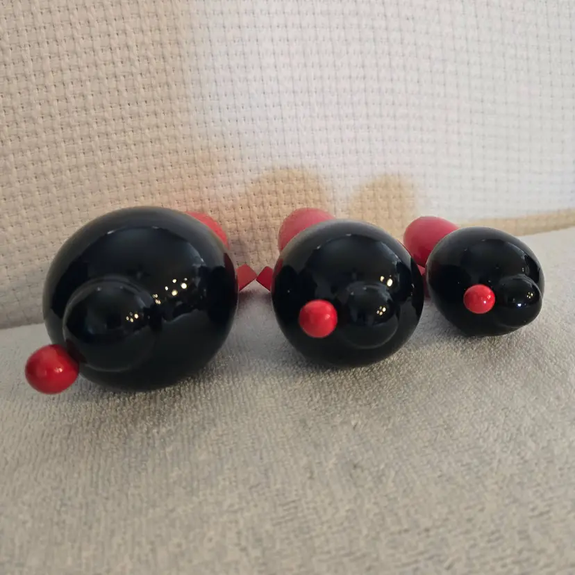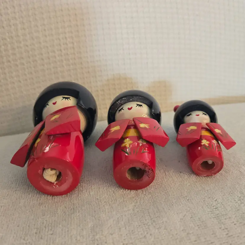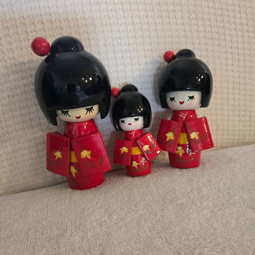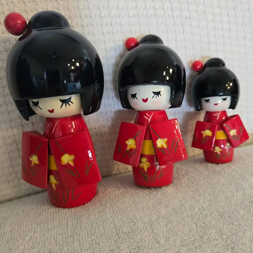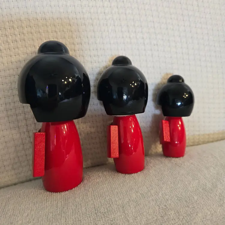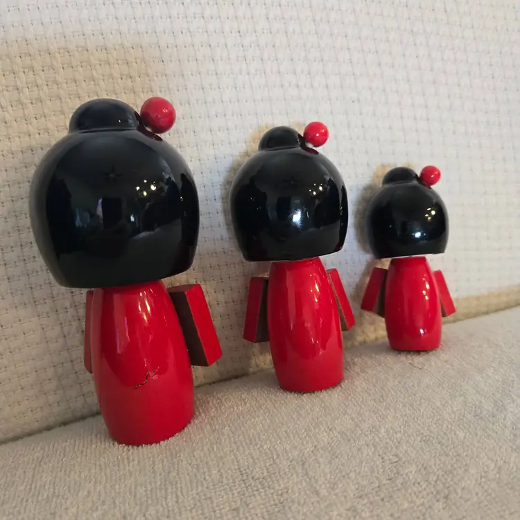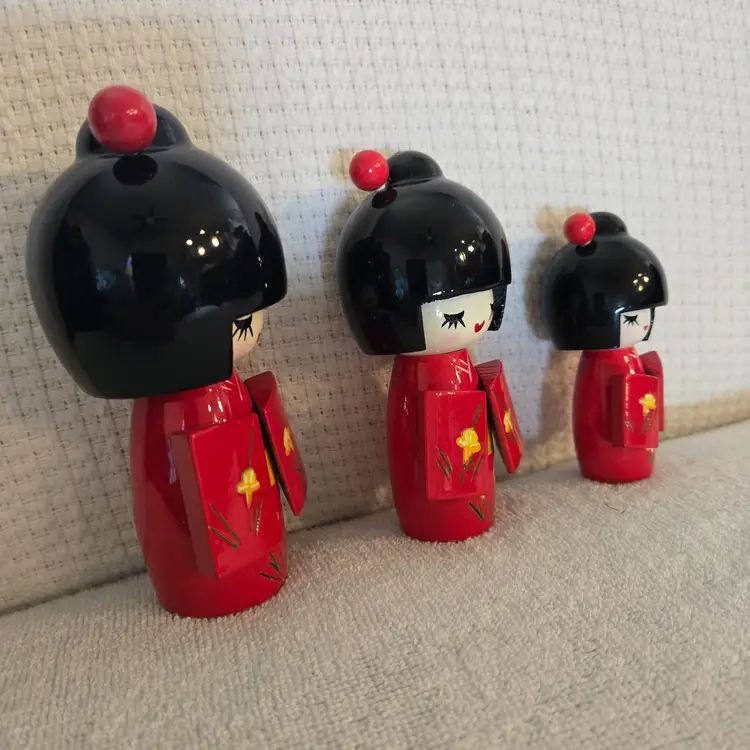 Hand carved lacquered Japan Kokeshi dolls. They have stretched elastic ropes so their heads can turn. Red and black with little yellow flowers. They are new but without the box. No damage or flaws to any of them. Tallest doll is 5 1/2" tall and 3 1/2" wide. Medium doll is 4 1/2" tall and 3" wide. Smallest doll is 2" tall and 1"wide.