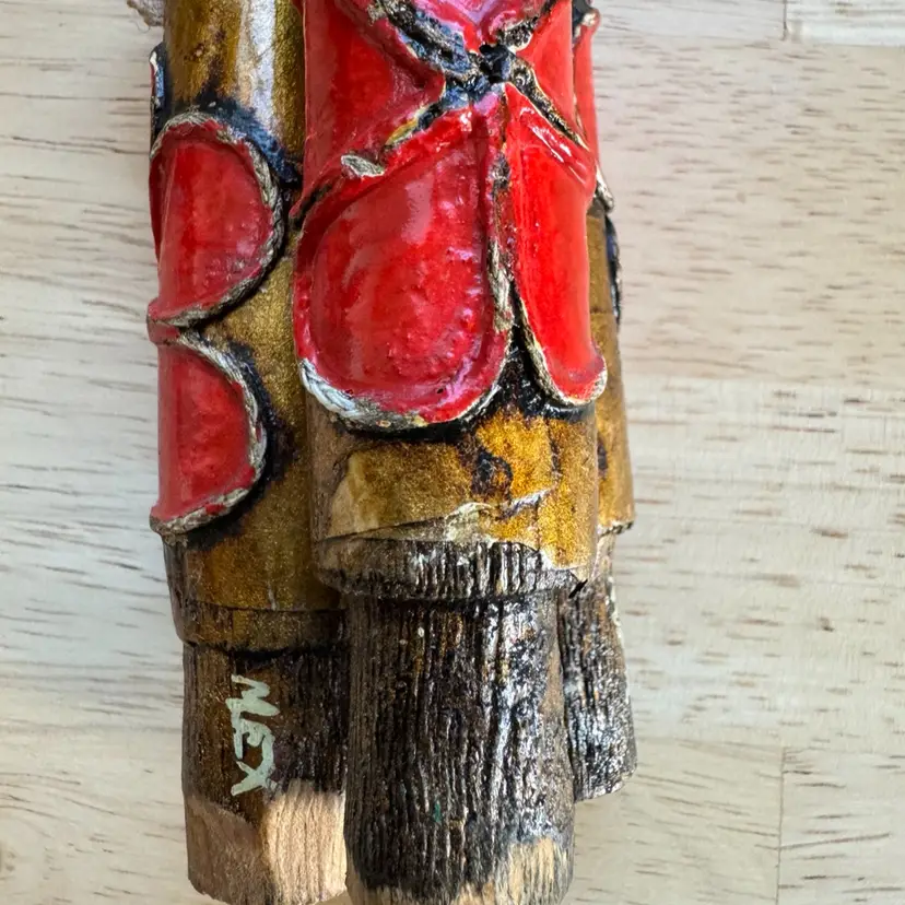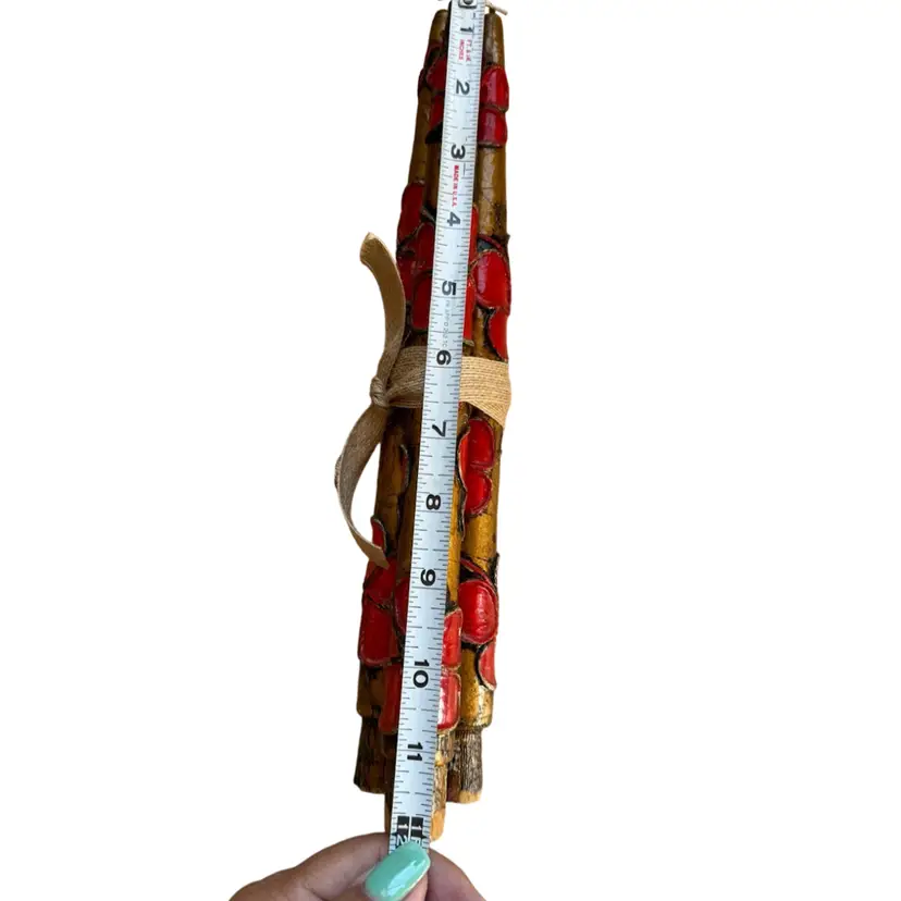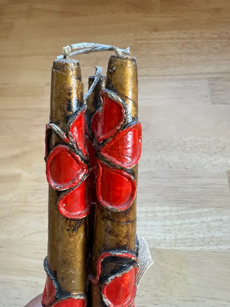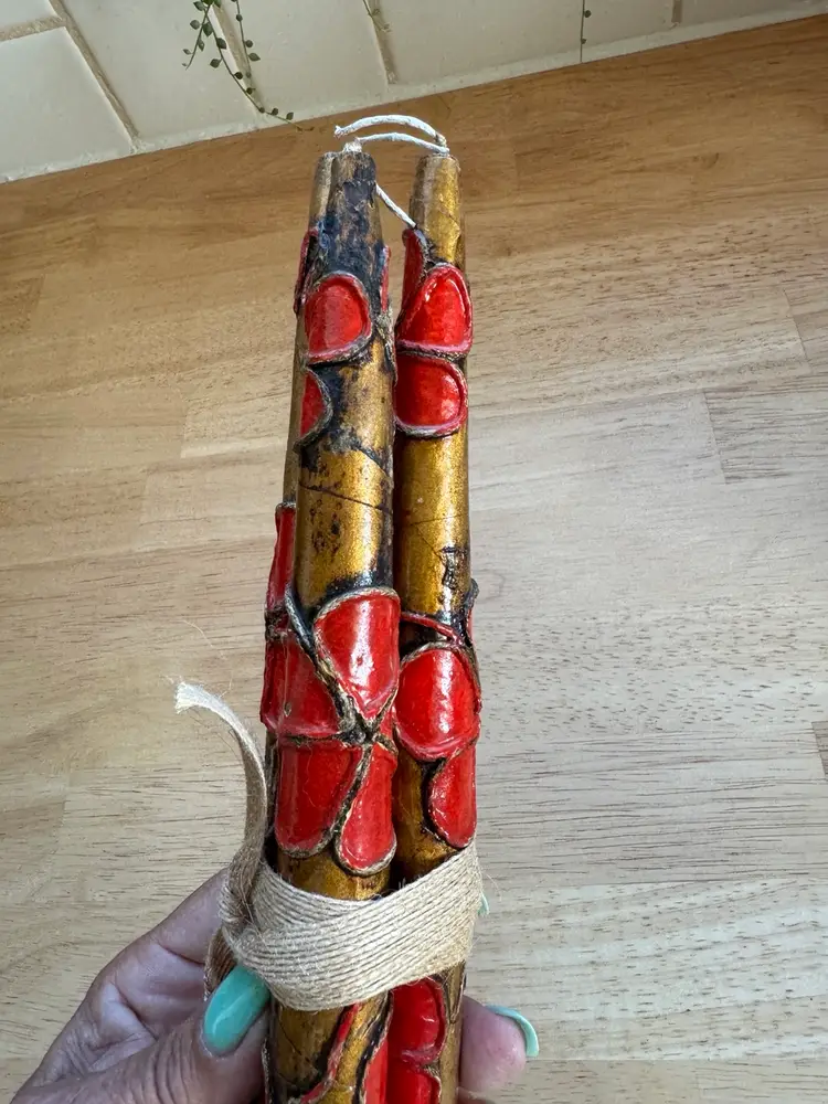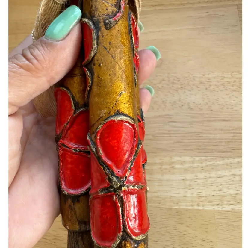 Three Mexican Wooden & Paper Mache Candle Sticks Gold/Red Vtg Flower Hippies great condition. Almost 12” tall Very retro!!