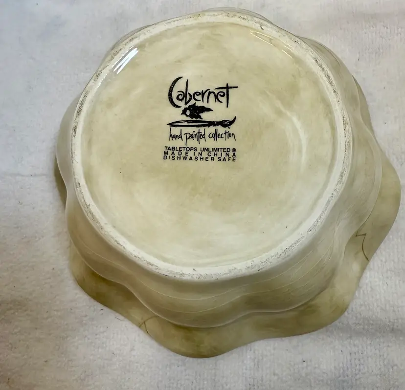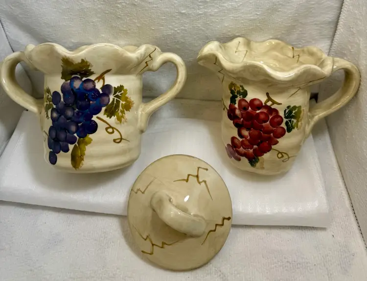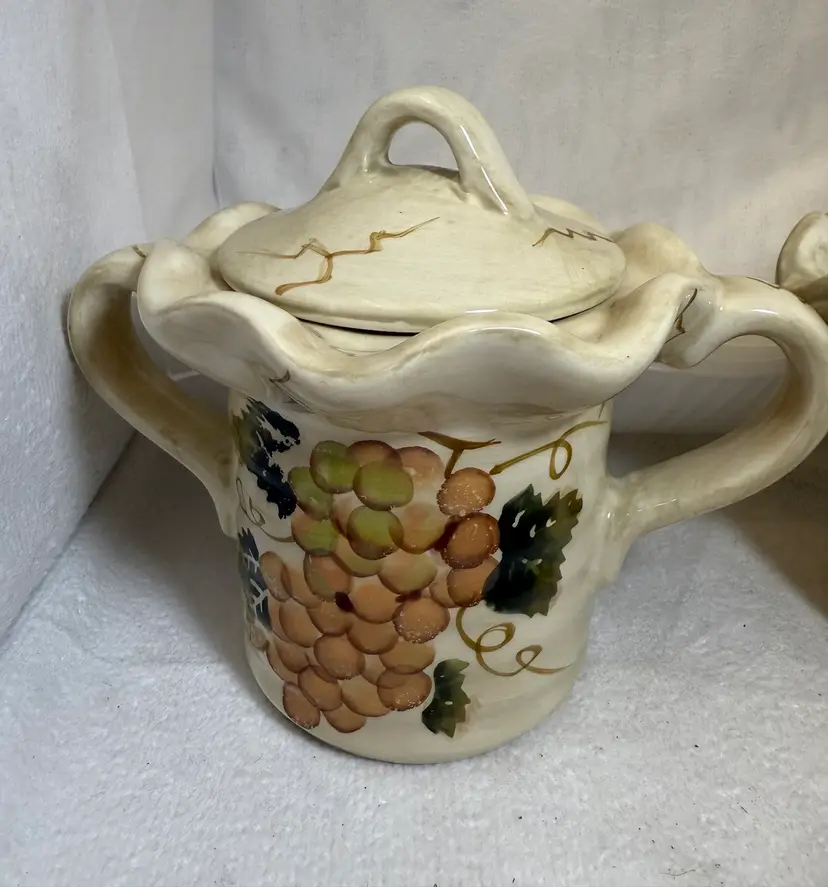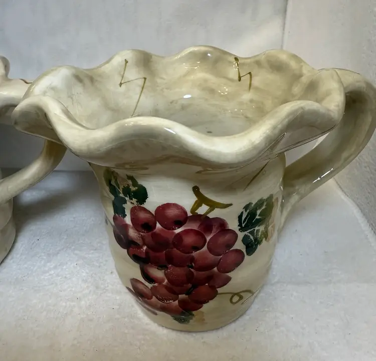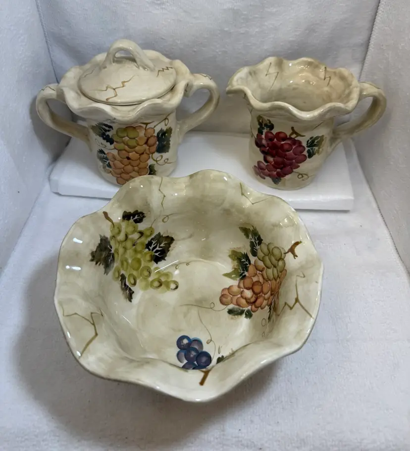 Beautiful ceramic bowl featuring hand-painted grape designs in vibration colors. The grape motif is a classic design element in kitchenware, evoking a sense of rustic charm and abundance. While not antique, these sets can still be appreciated for their aesthetic appeal and functionality. Excellent condition there are no chips, cracks, or