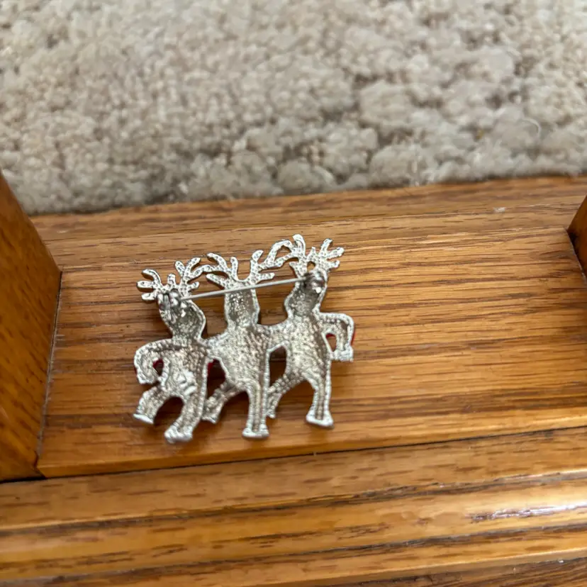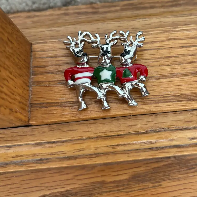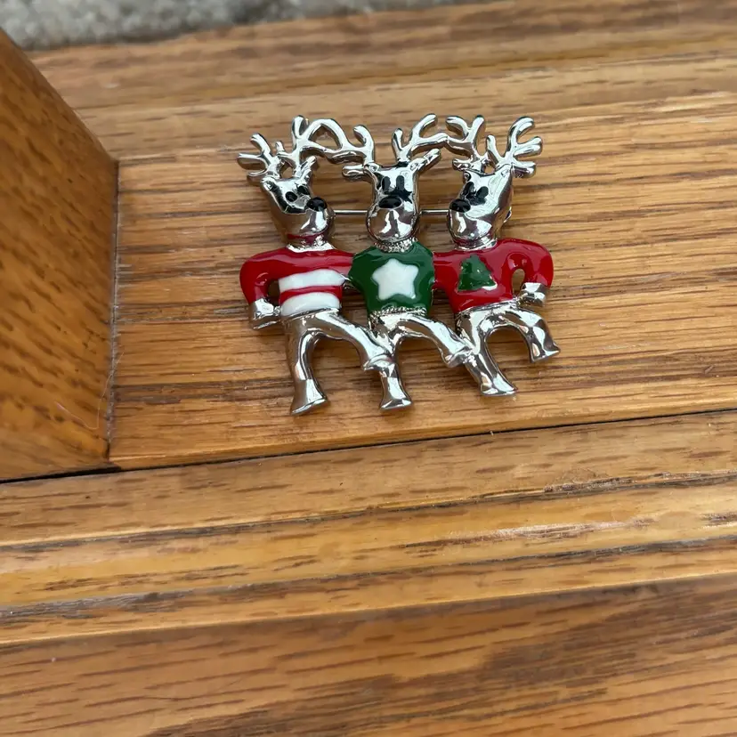 A festive brooch featuring three adorable reindeer. Each reindeer wears a colourful sweater, one with a green star! It's a cute accessory for the holiday season.