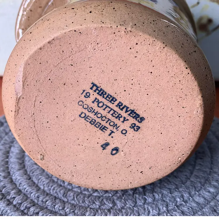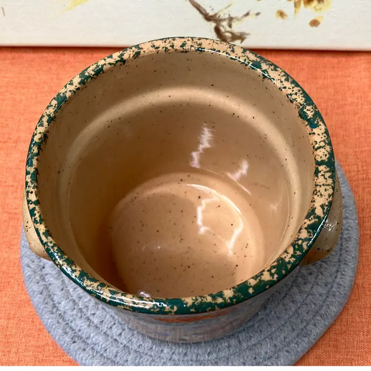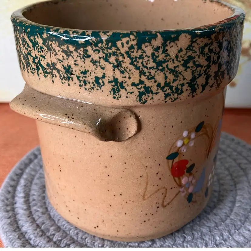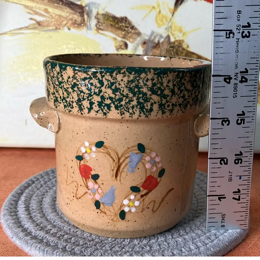 Speckle glaze. Floral heart design on front. Good condition. Very cute! Made in Ohio.