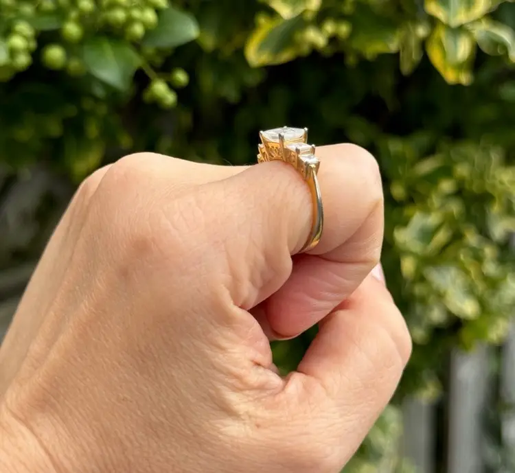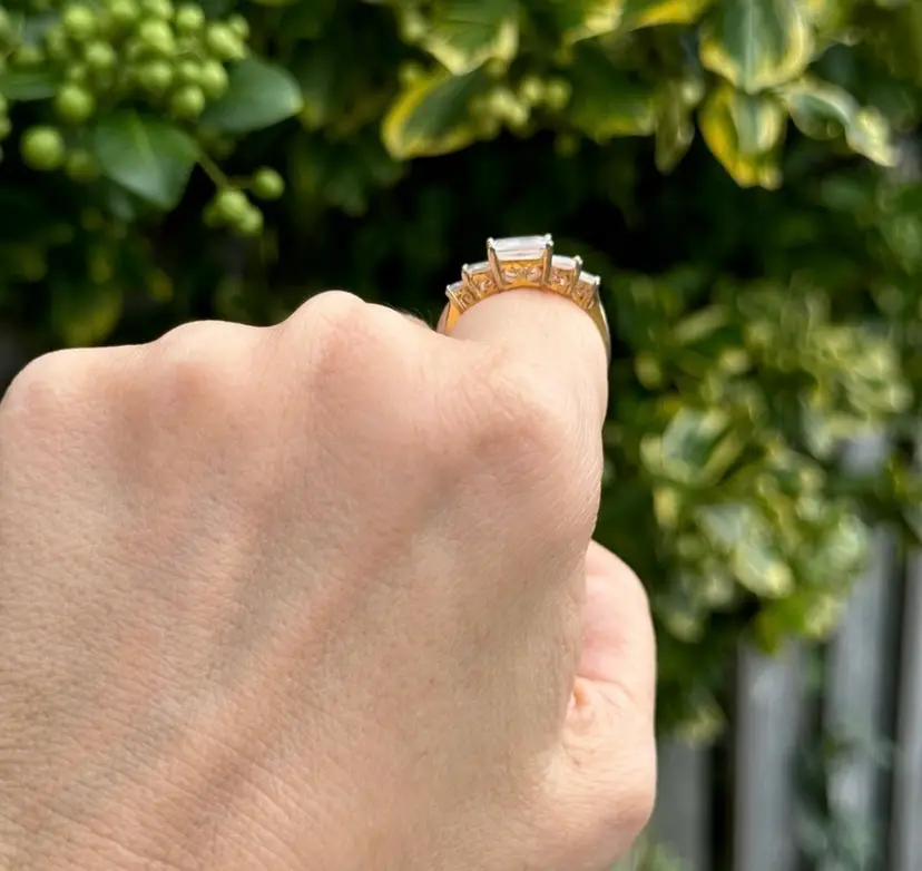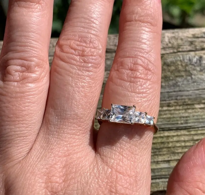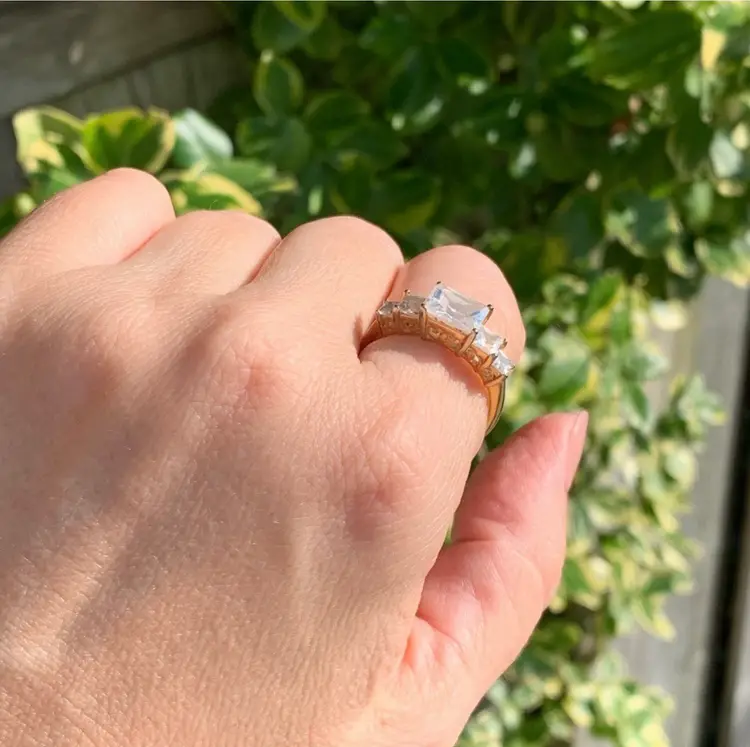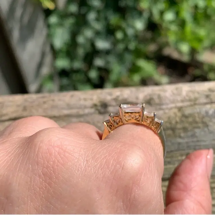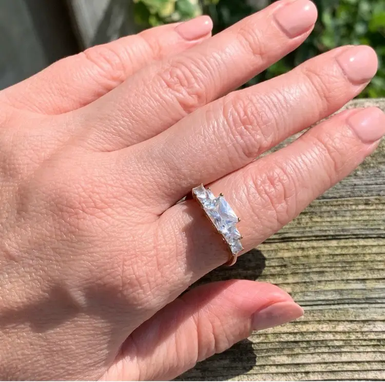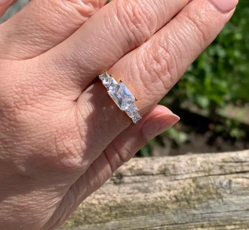 Gold-tone ring. Features a large emerald-cut centre stone flanked by two smaller stones. Elegant design. Looks great worn.