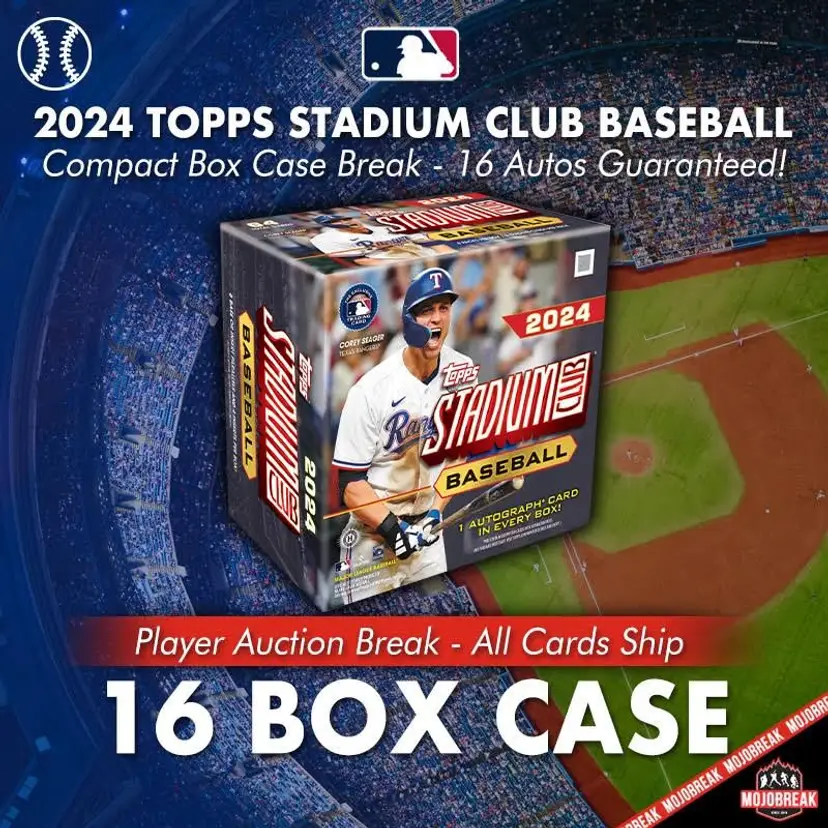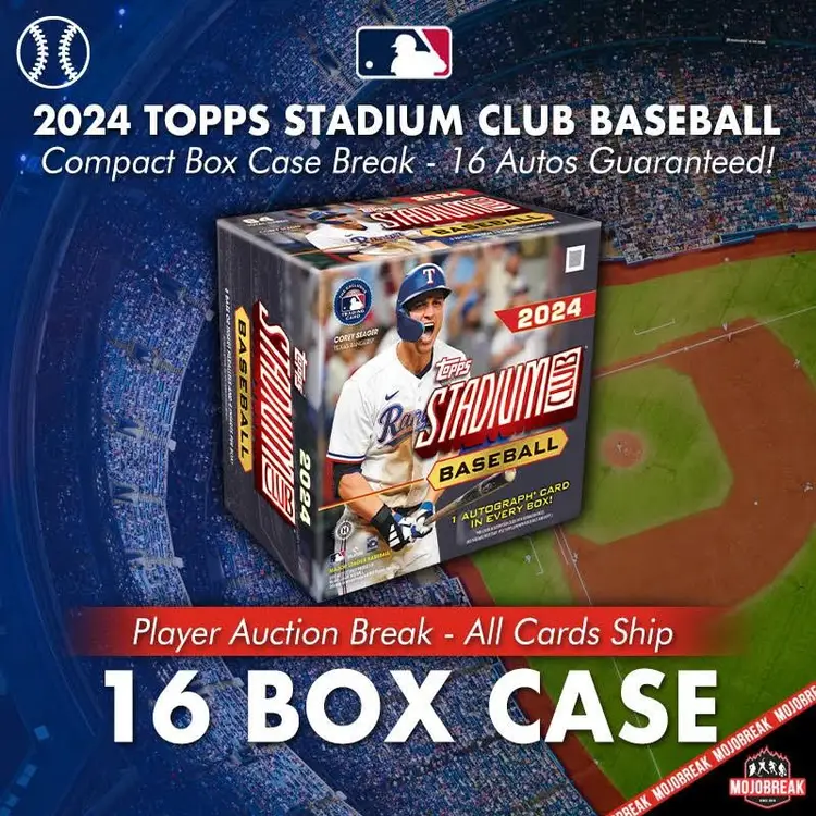 You are bidding on all the cards of the player listed in the title in this CASE (16x Compact Boxes) of 2024 Topps Stadium Club Baseball Cards. Case will be opened LIVE after auctions end on Thursday 11/07/2024. Opening will be viewable & simulcast on Mojobreaks' District as well as YouTube and Twitter. US Shipping is $5.00 for your first auction spot won; each spot after that is FREE SHIPPING! Any spot won where no cards of the player are found in the box will receive a bonus card or pack from Mojobreak. Any hit pulled (Cut Autos, Sketches, Hidden Gems, etc) of a subject who is NOT listed in the auction will be assigned by draw between all participants. Any dual or multi-player #'d or auto cards featuring multiple subjects will be assigned live between the spots depicted on the card. *Note - most Autograph-Only subjects are grouped by specific Team in listings that specify the included players.