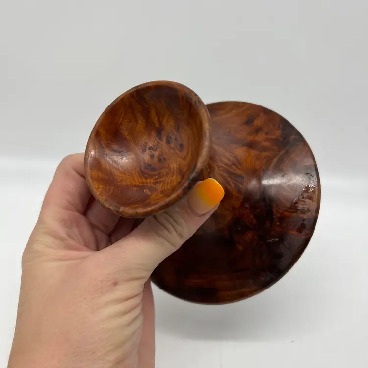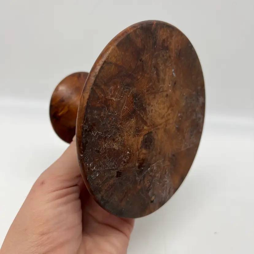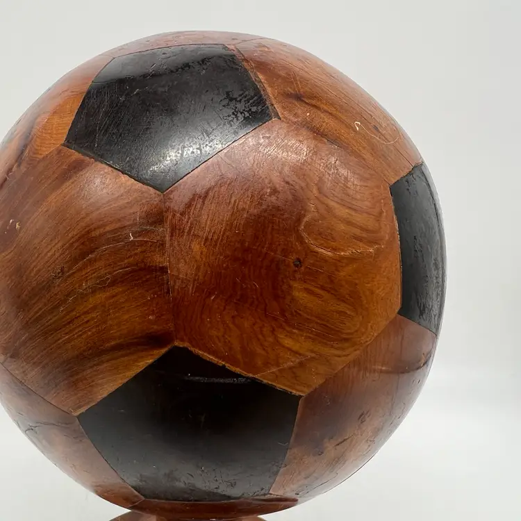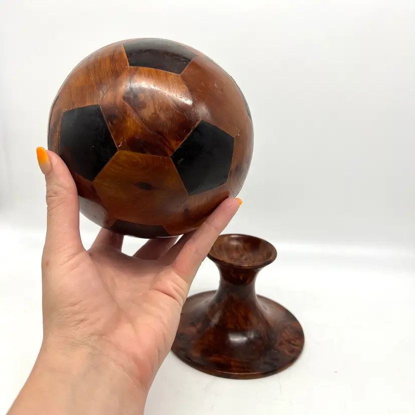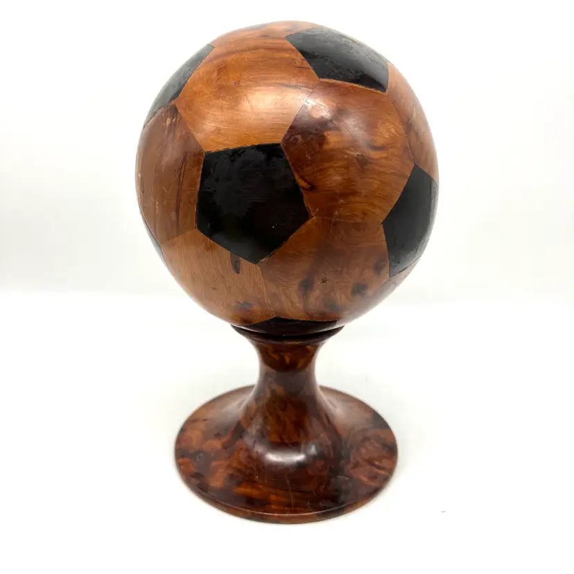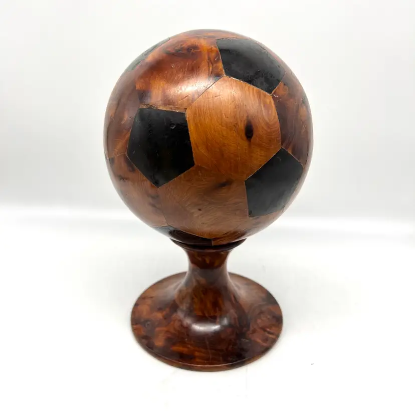 This wooden soccer ball sits on a pedestal. It iis made of thuya wood. It measures approx 9" tall. There is some scuffing.