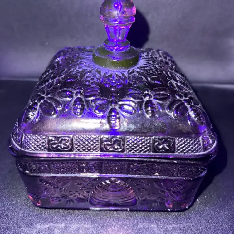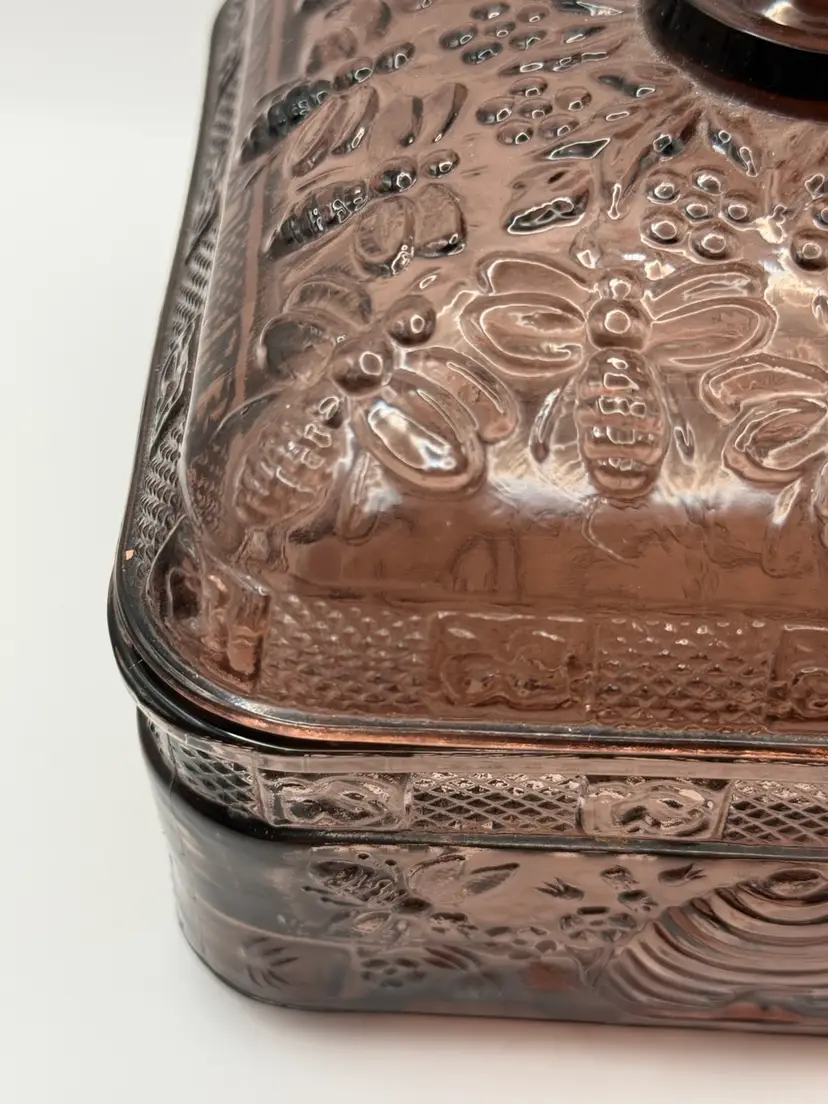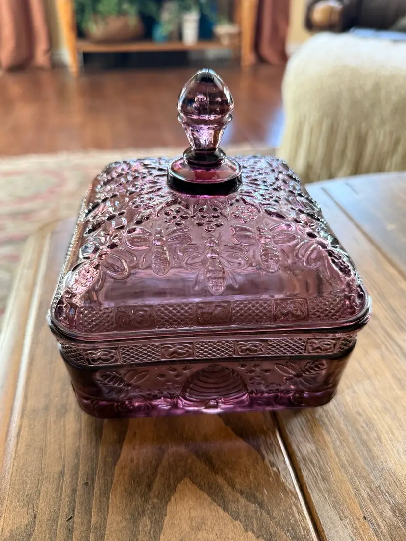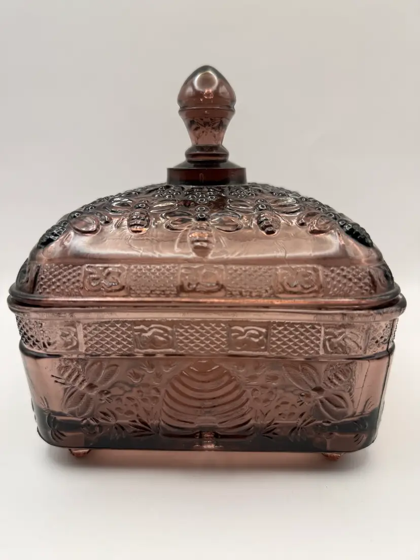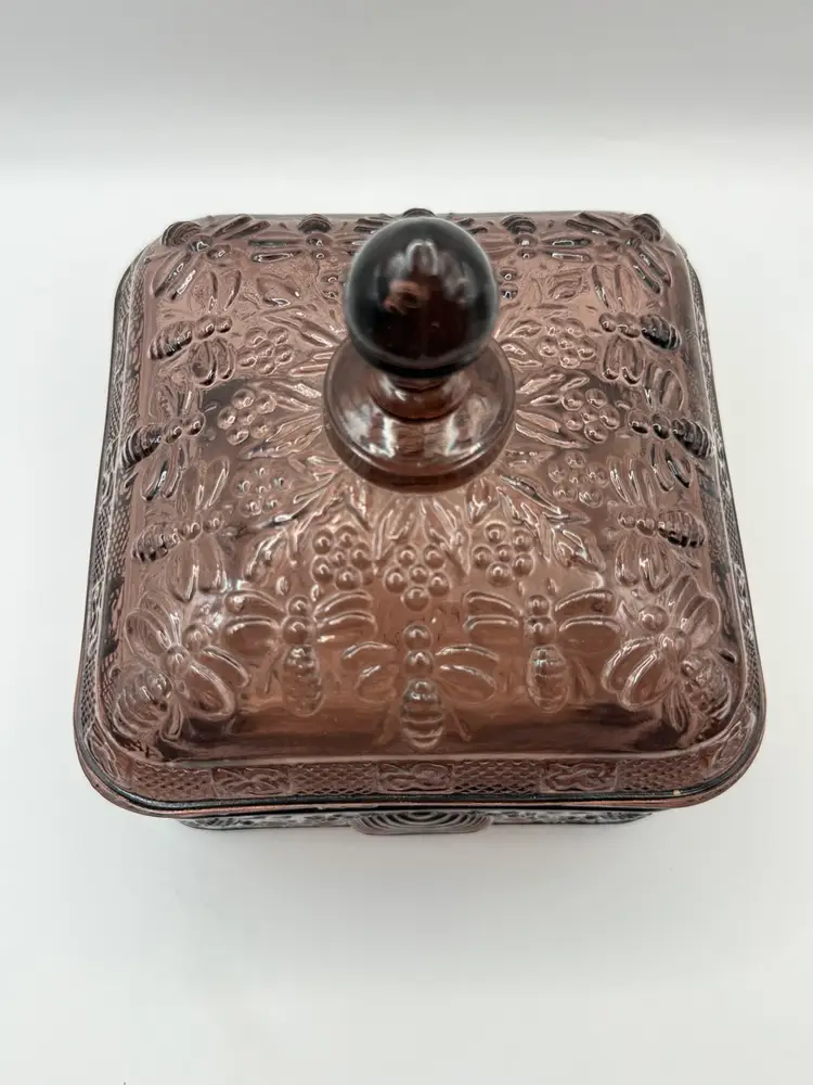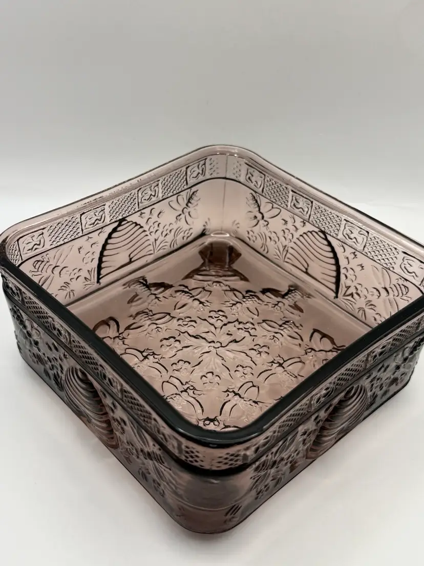 Very collectible vintage “Tiara Indiana Glass Honey Bee Honey Hive Candy Square Dish With Lid. “Has some green glow that was hard to capture in pics 🐝Overall good condition , but does have a minor flea bite chip on edge of bottom piece 5”x 5”x 6”