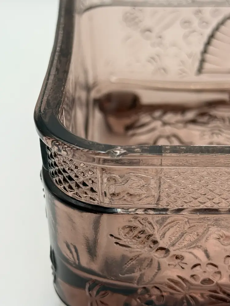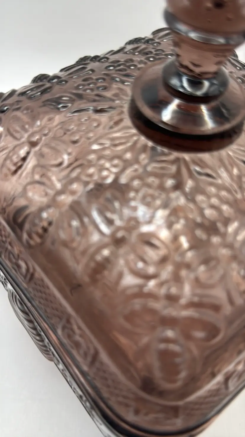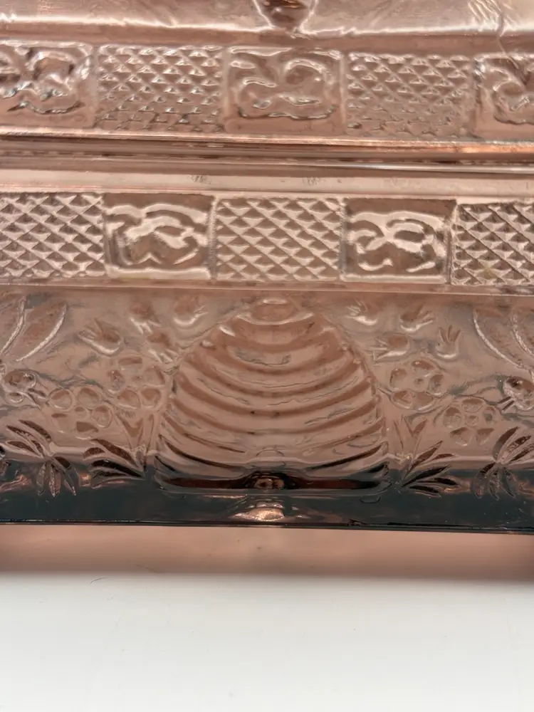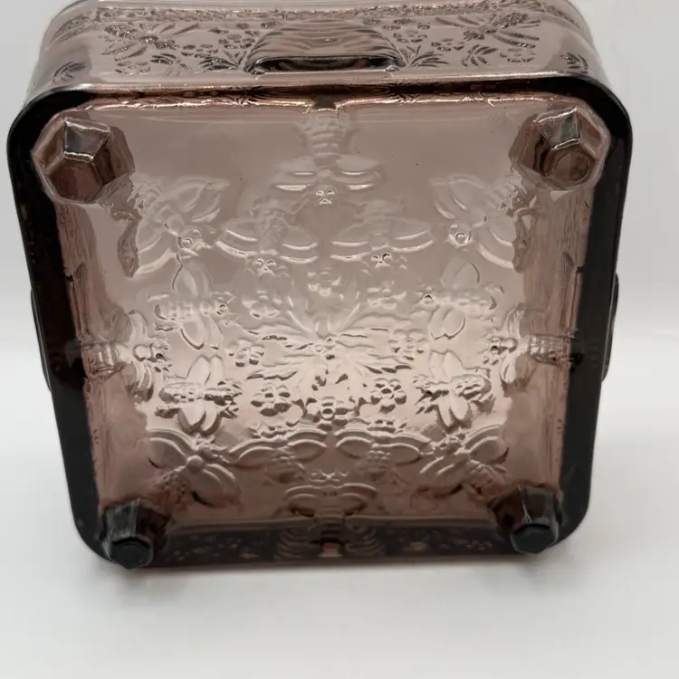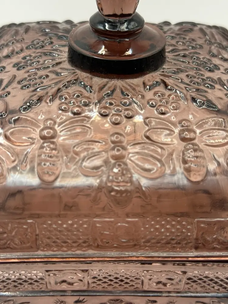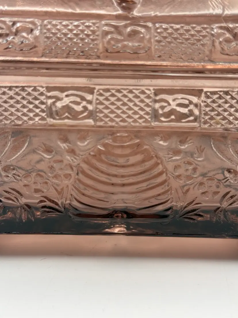 Very collectible vintage “Tiara Indiana Glass Honey Bee Honey Hive Candy Square Dish With Lid. “Has some green glow that was hard to capture in pics 🐝Overall good condition , but does have a minor flea bite chip on edge of bottom piece 5”x 5”x 6”