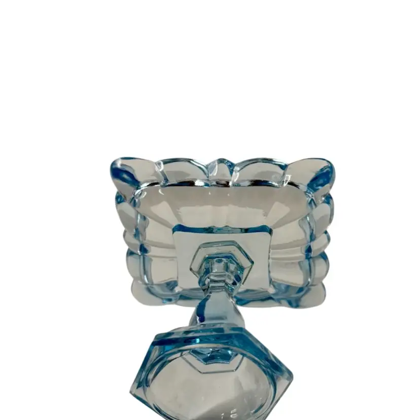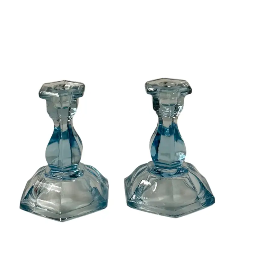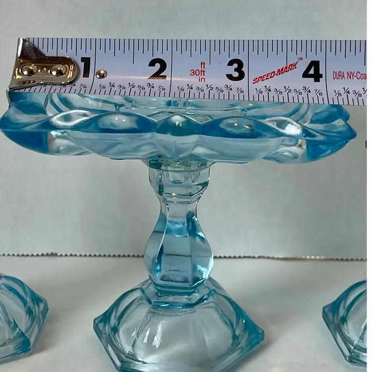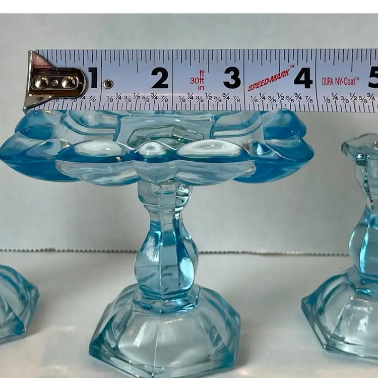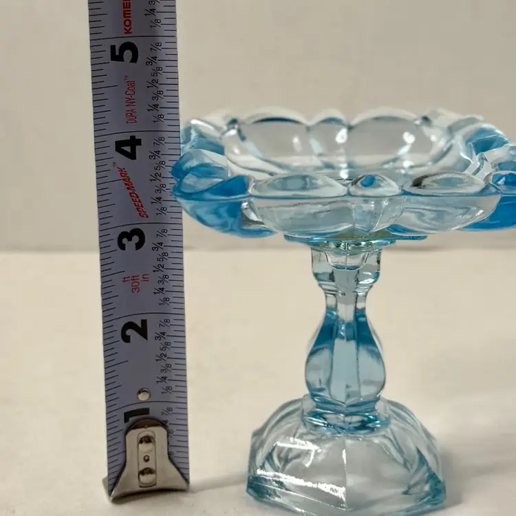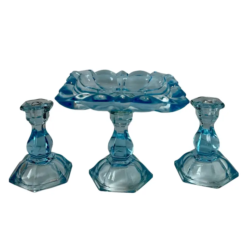 Beautiful ice blue pedestal tray that could be used for displaying glass candy, favorite marbles, or ashtray. Candle holders are for approximately a 1/2” tapered candle. Condition: No condition issues on the candle holders. The tray has a few very small flea bites on the edges. There is a chip underneath on one of the corners that is smooth. Measurements: Tray: Approximately 3.75” T x 4.25” x 3.25”. Candle sticks: Approximately 3” T x 1.25” (top) x 2.25” (base). Please see pictures for condition and measurements as they are part of the description. N9-7 Thank you for looking!