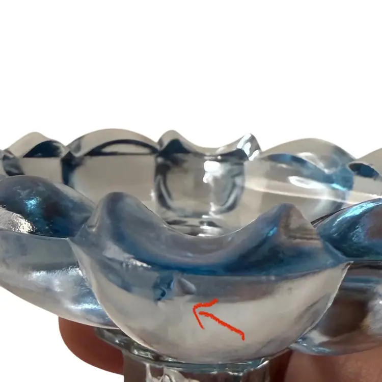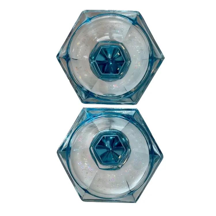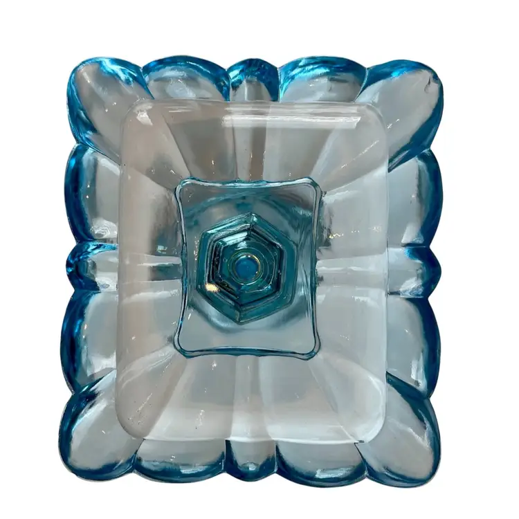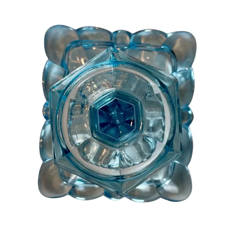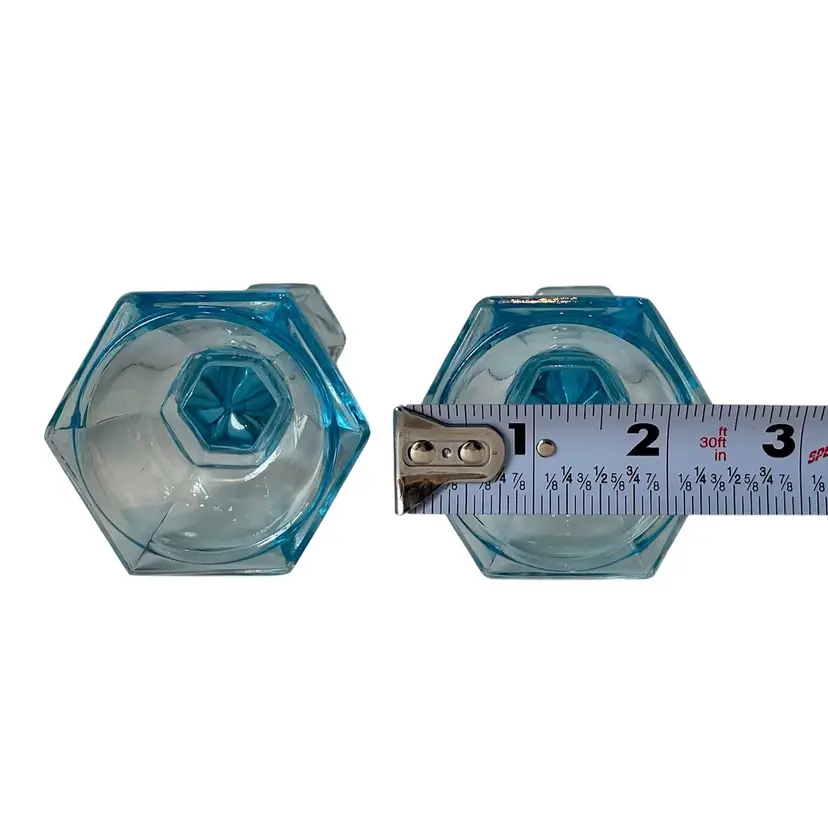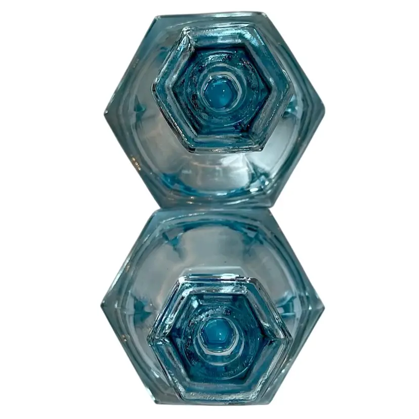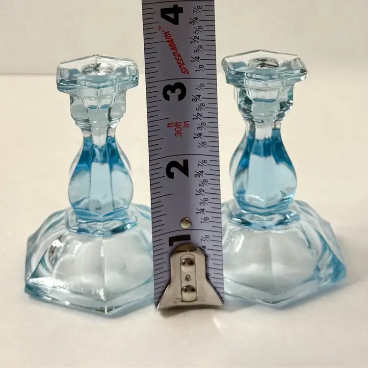 Beautiful ice blue pedestal tray that could be used for displaying glass candy, favorite marbles, or ashtray. Candle holders are for approximately a 1/2” tapered candle. Condition: No condition issues on the candle holders. The tray has a few very small flea bites on the edges. There is a chip underneath on one of the corners that is smooth. Measurements: Tray: Approximately 3.75” T x 4.25” x 3.25”. Candle sticks: Approximately 3” T x 1.25” (top) x 2.25” (base). Please see pictures for condition and measurements as they are part of the description. N9-7 Thank you for looking!