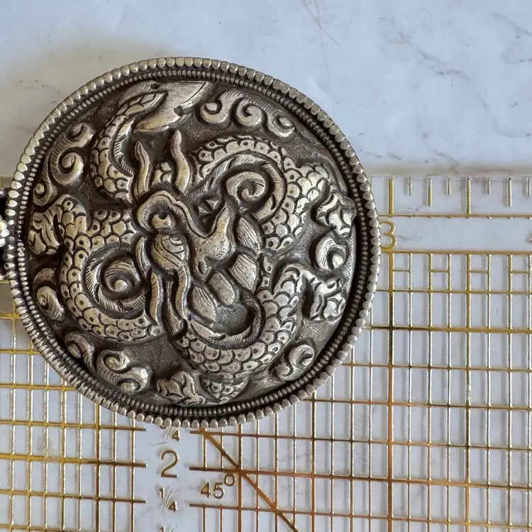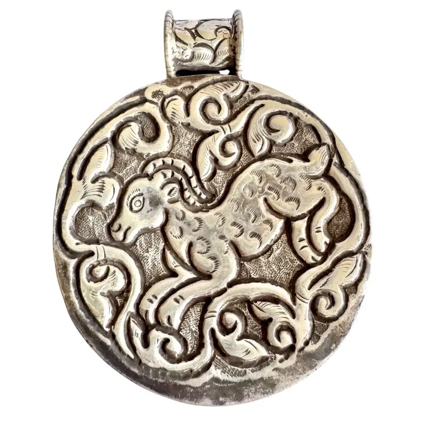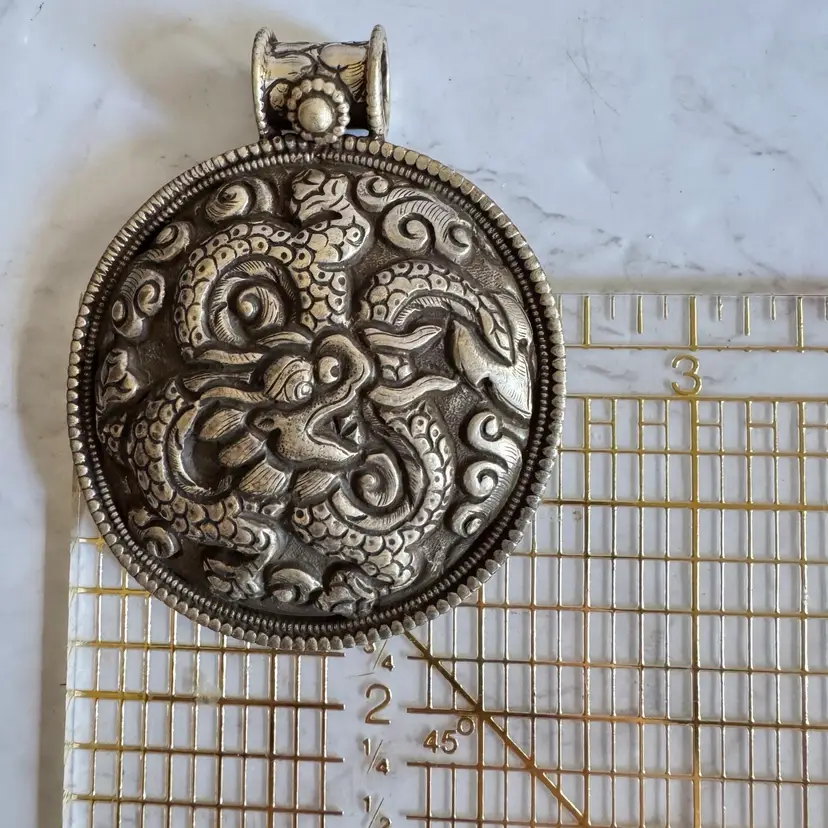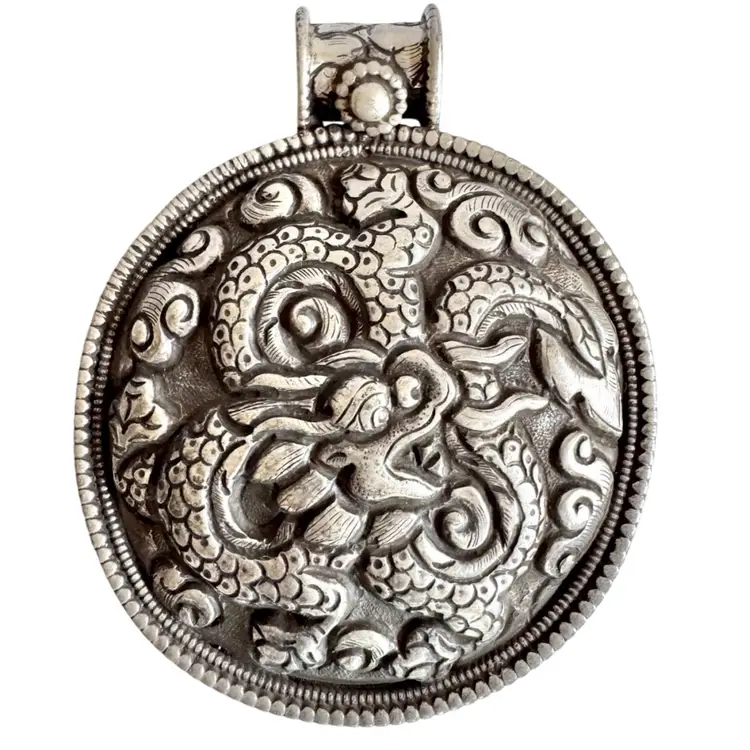 Tested as sterling silver or higher. Good condition with signs of wear due to age. 2-7/8”h x 2-3/8”w. Weighs 46g. This Tibetan pendant features a detailed dragon design on the front, symbolizing power, transformation, and protection against negative forces in Himalayan Buddhist tradition, crafted with intricate repoussé work to highlight the dragon’s scales and claws. On the back, a horned goat or ram-like figure—possibly a stylized representation of a mountain goat or mythical Tibetan antelope—dominates the design, symbolizing resilience, agility, and guardianship of high altitudes. Handcrafted, likely from a mid-19th to early 20th-century Himalayan workshop, this piece serves as both a striking necklace focal point and a potent amulet, ideal for collectors or cultural enthusiasts.