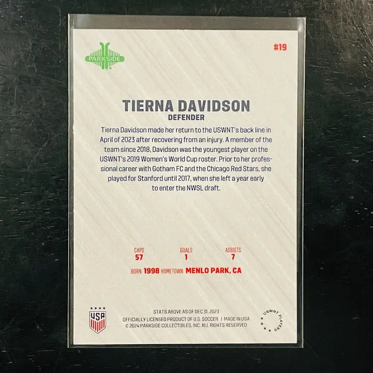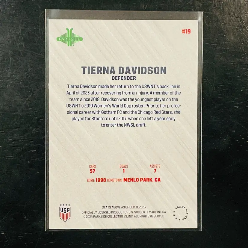 Card Size: Standard Set: 2023 Parkside USWNT Recap Year Manufactured: 2023 Player/Athlete: Tierna Davidson Original/Licensed Reprint: Original Type: Sports Trading Card Sport: Soccer Language: English Manufacturer: Parkside Features: Base Set Team: United States Card Number: 19 Season: 2023
