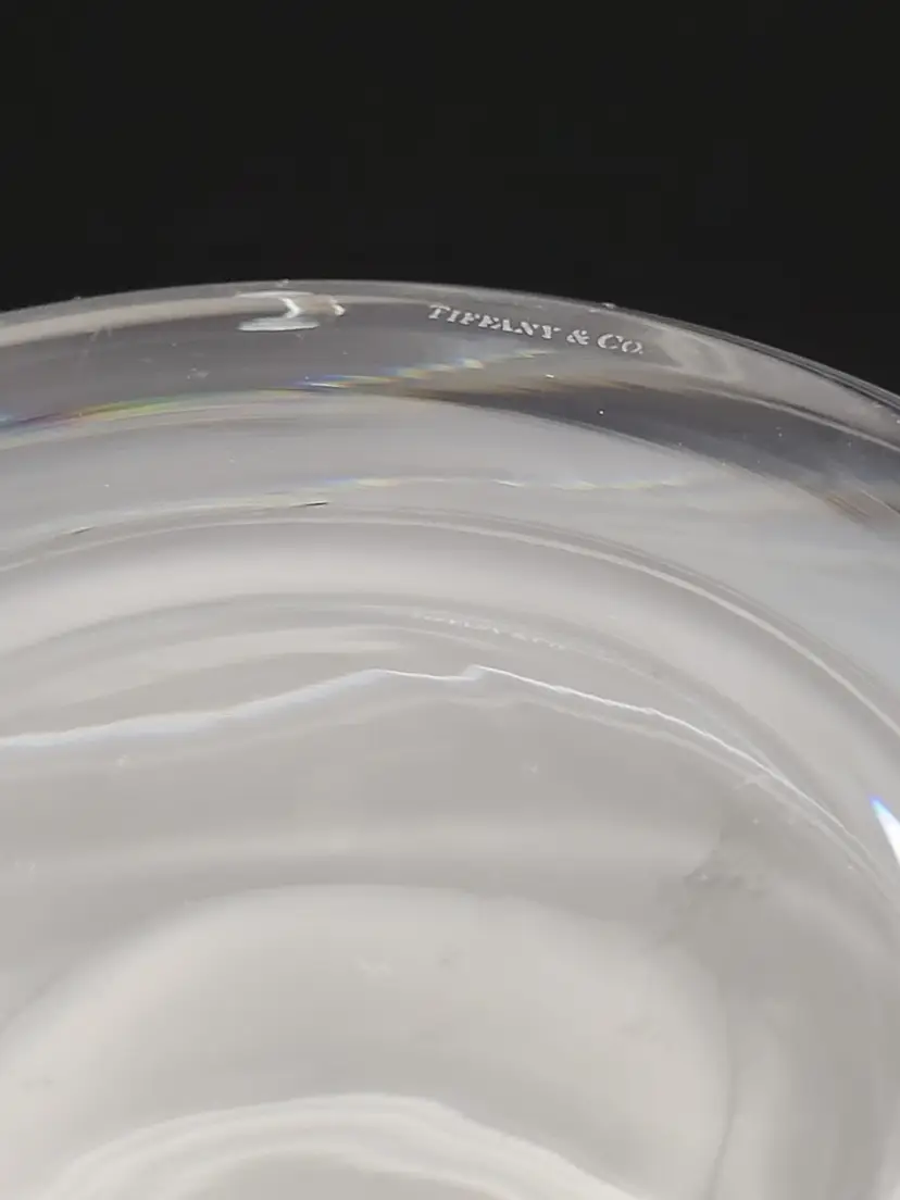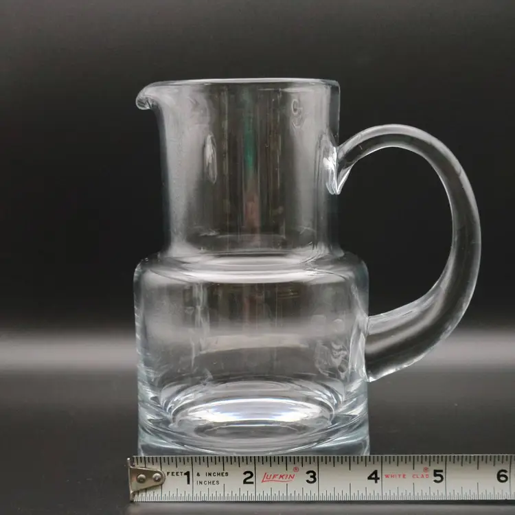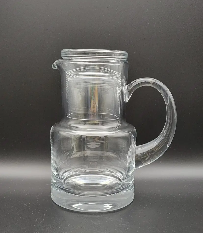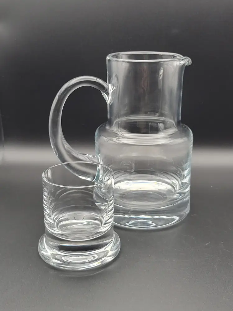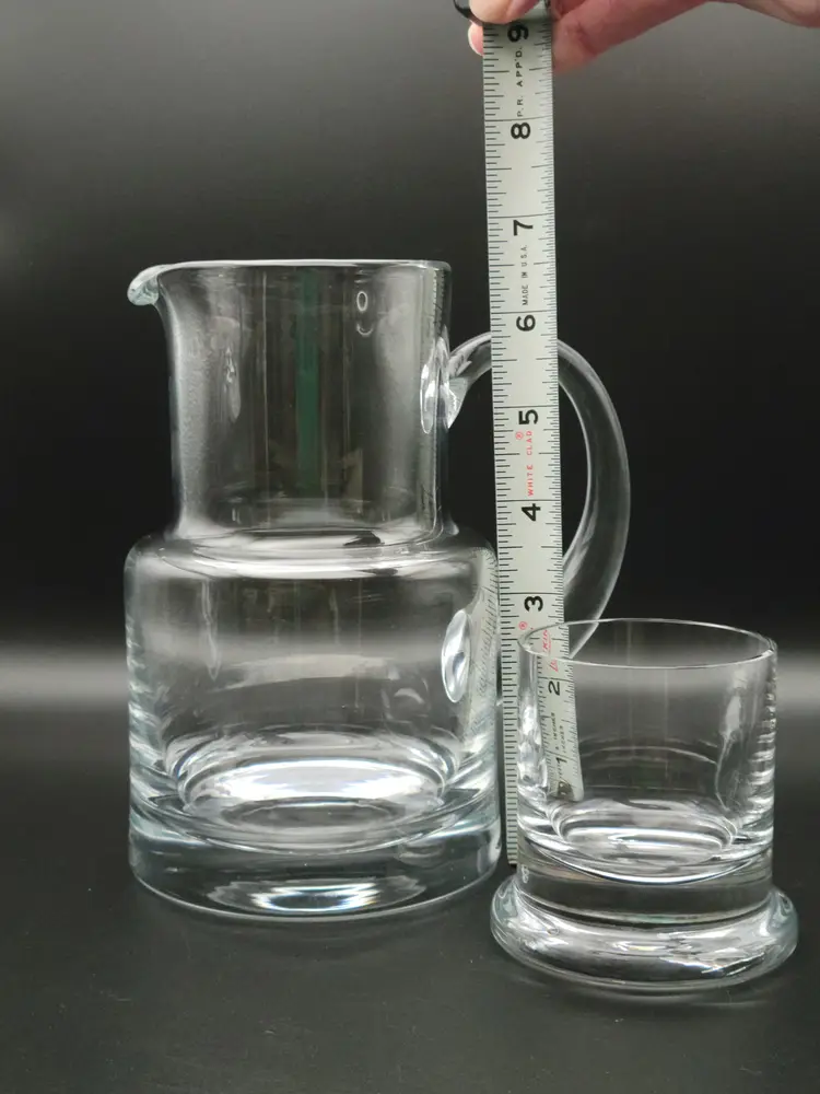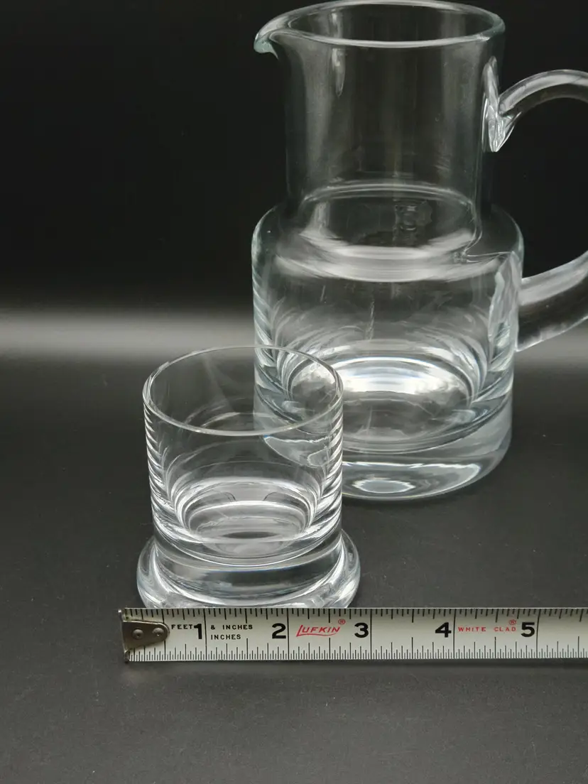 Beautiful bedside water pitcher and glass from Tiffany and Co. Good condition with minor surface scratches see pictures. Pitcher measures approx 6.5 inches, 4 inches wide at base and 5.5 inches wide with handle Glass measures approx 2.75 inches high, 2.5 inches at opening and 3 inches at base. Etched with Tiffany and Co on bottom of pitcher.