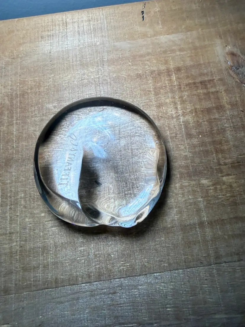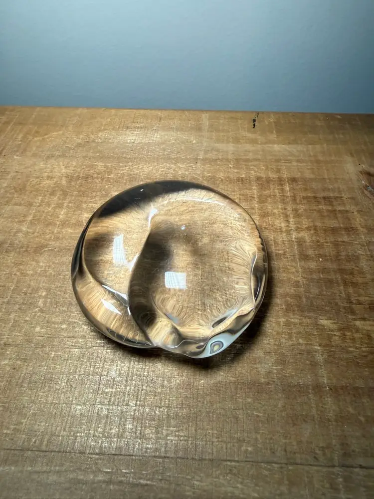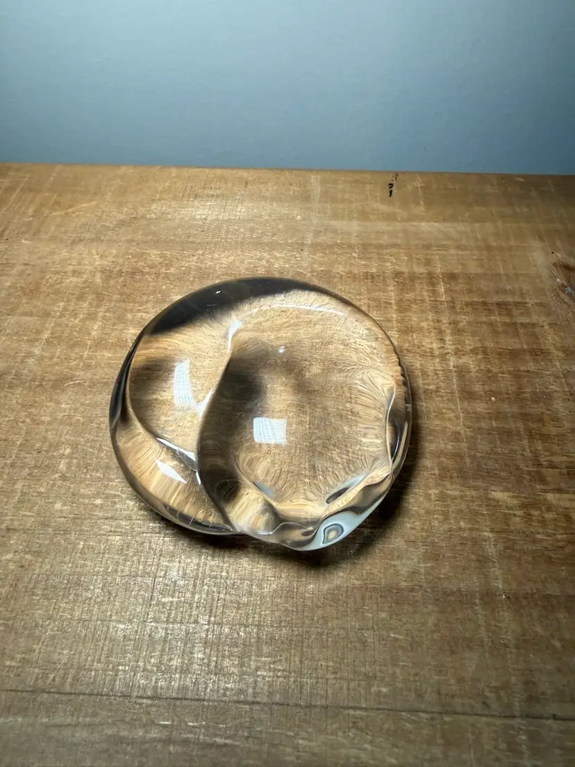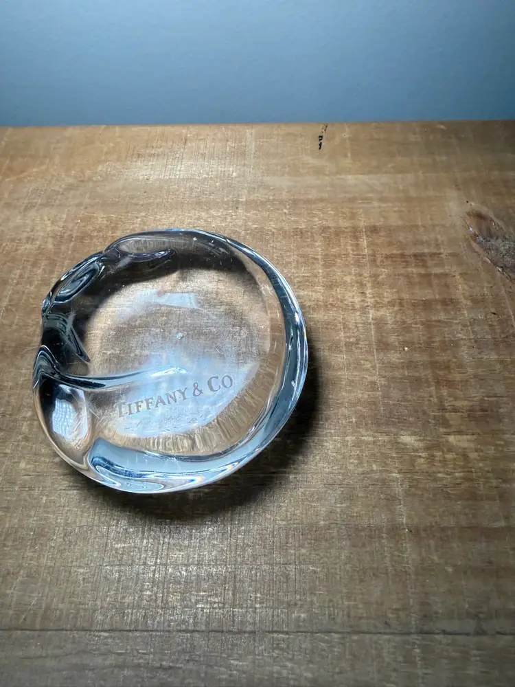 This elegant desk accessory is crafted from high-quality clear crystal featuring a smooth, ergonomic indentation designed as a 'worry stone' or thumbprint rest. Ideal for office decor or as a luxury paperweight. Etched 'TIFFANY & CO' hallmark on the base.