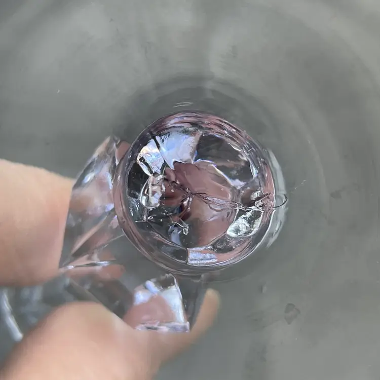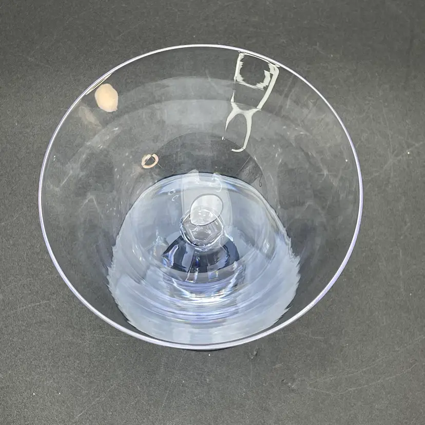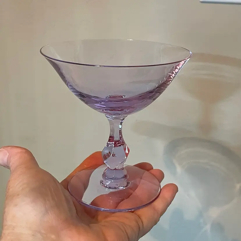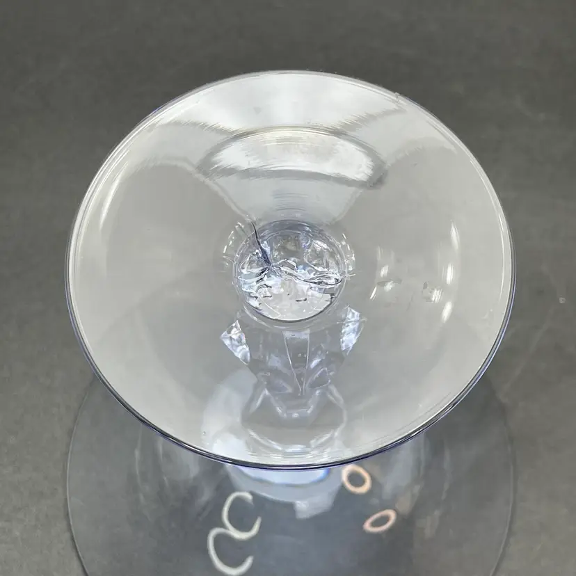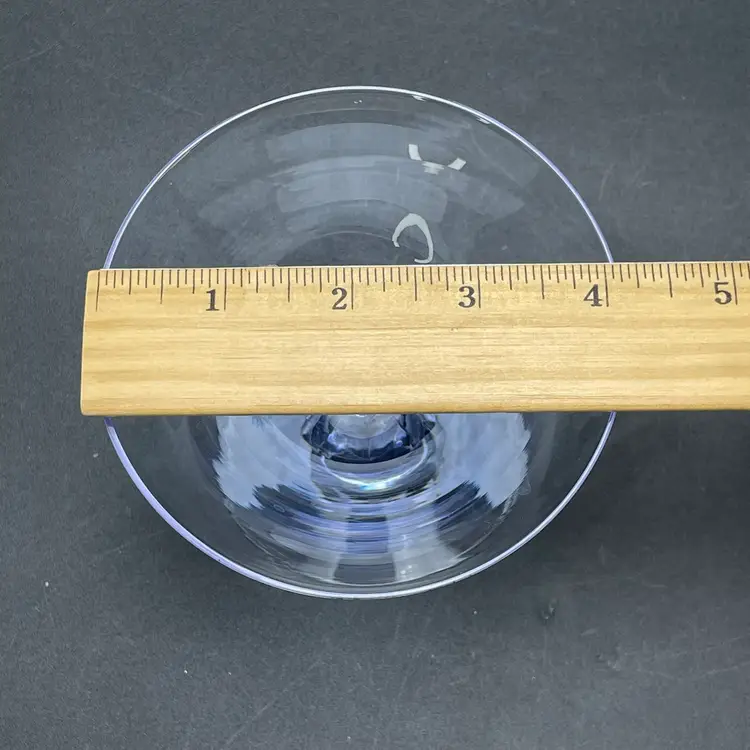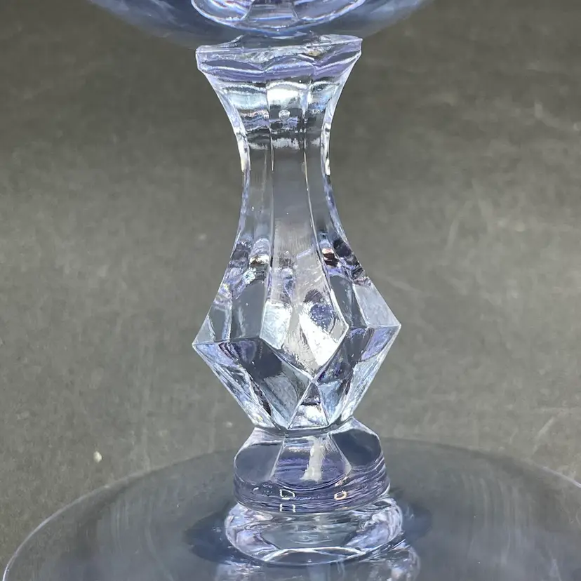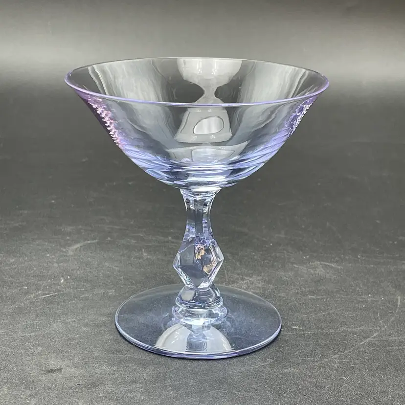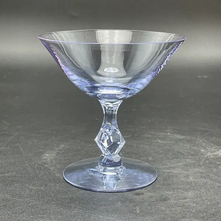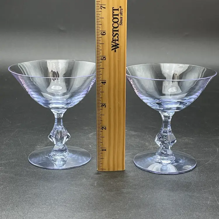 This is a vintage set of 2 blown glass Tiffin #17492 Twilight Blue neodymium champagne/tall sherbert glasses. These look blue in some light and purple in other. Made in the USA. Each measure approximately 4.25" tall x 4" across. There is a pontil mark on the bottom of each one. No chips or cracks.